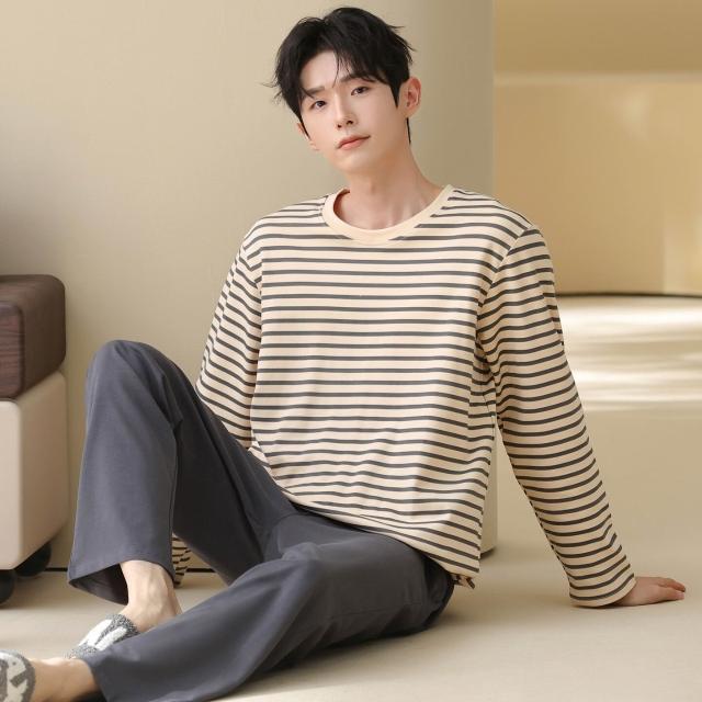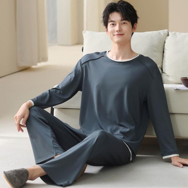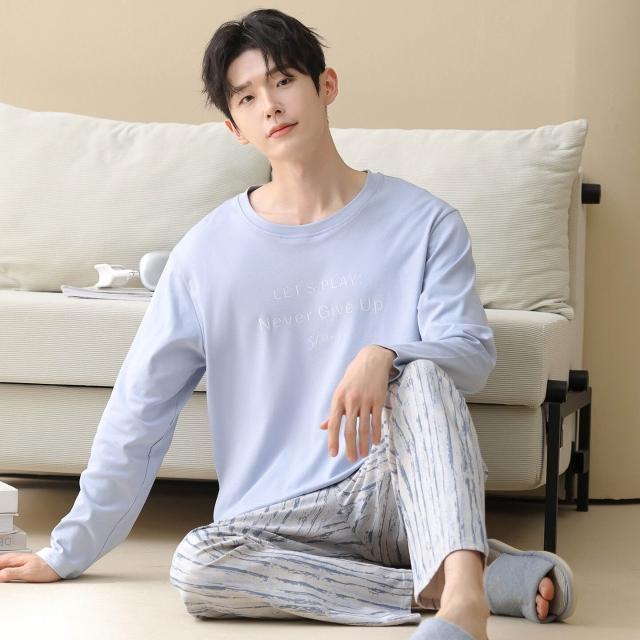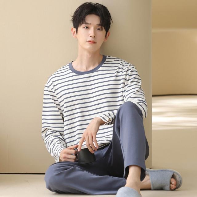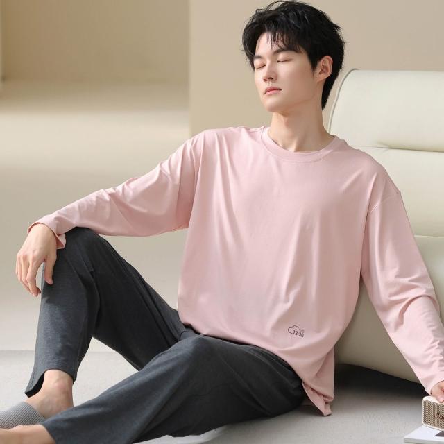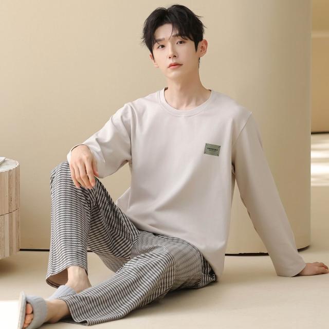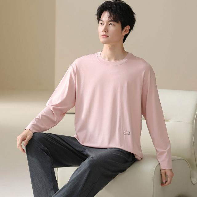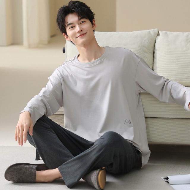 雲溪 長袖純棉睡衣男士春秋季新款簡約舒適圓領套頭全棉家居服套裝秋冬