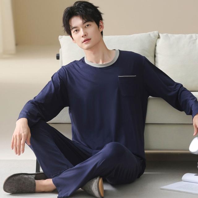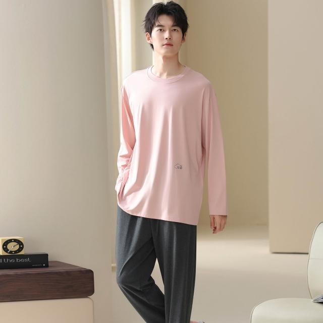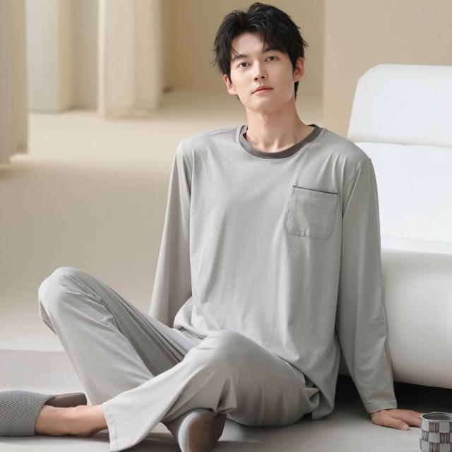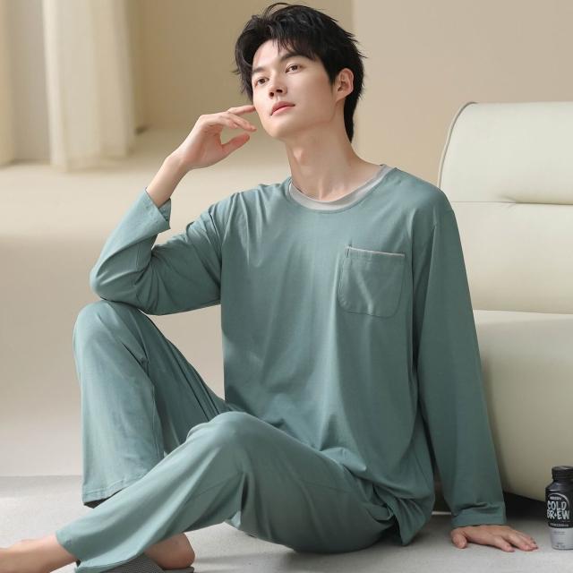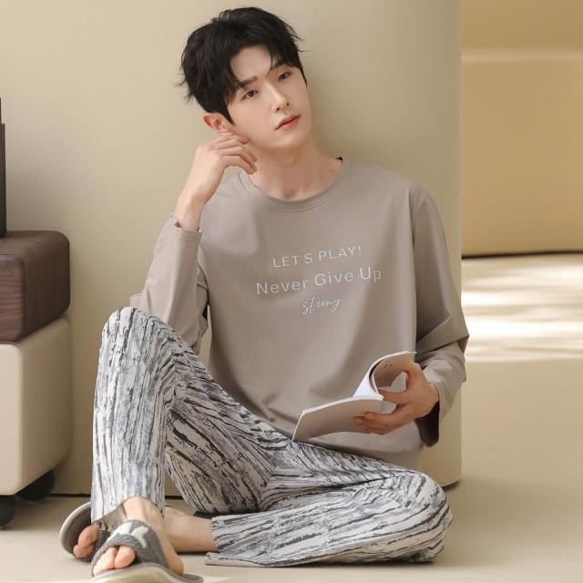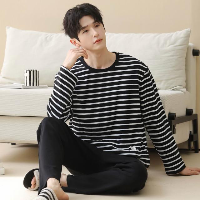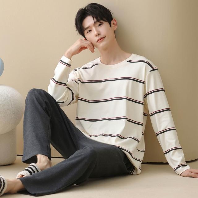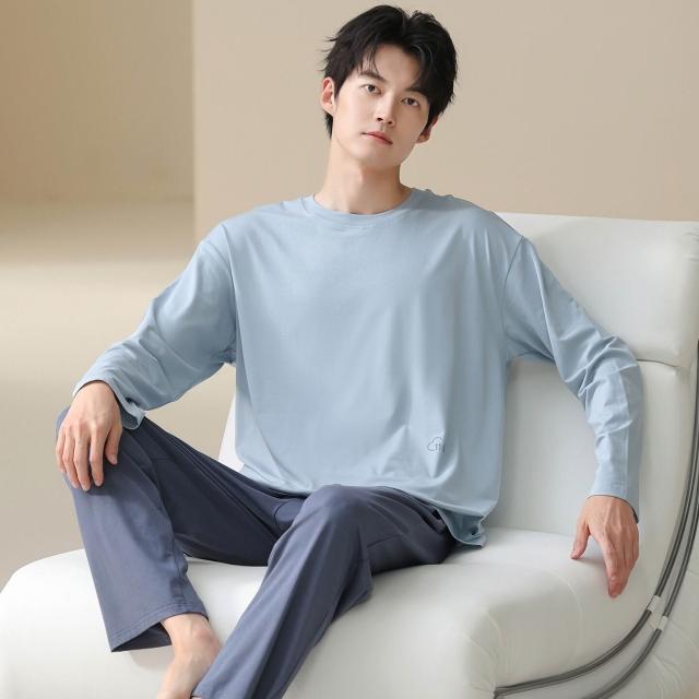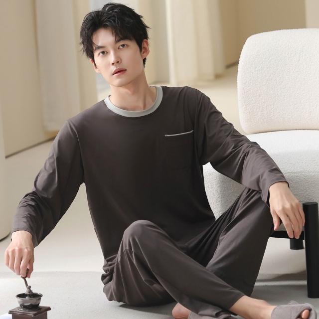 雲溪 長袖純棉睡衣男士春秋季新款簡約舒適圓領套頭全棉家居服套裝秋冬