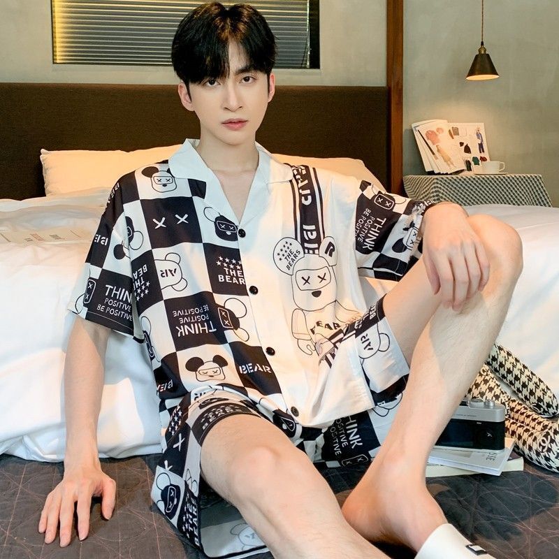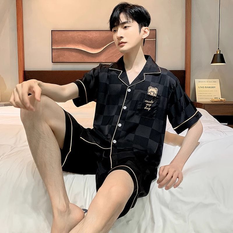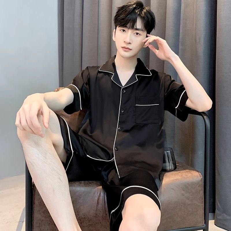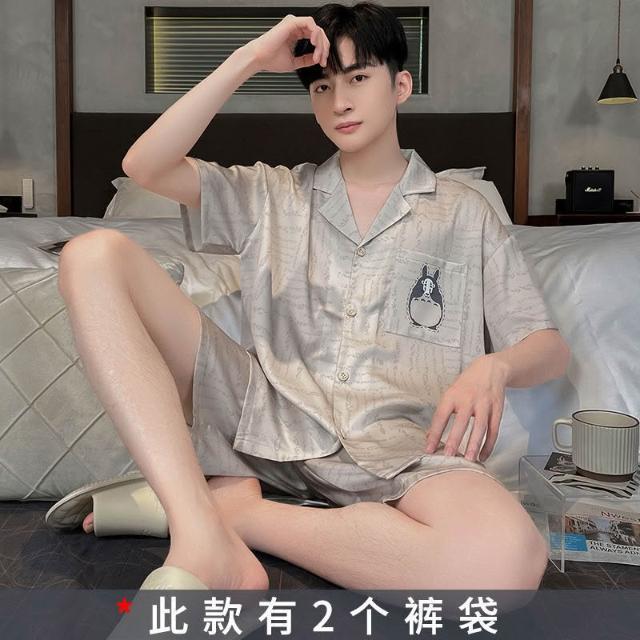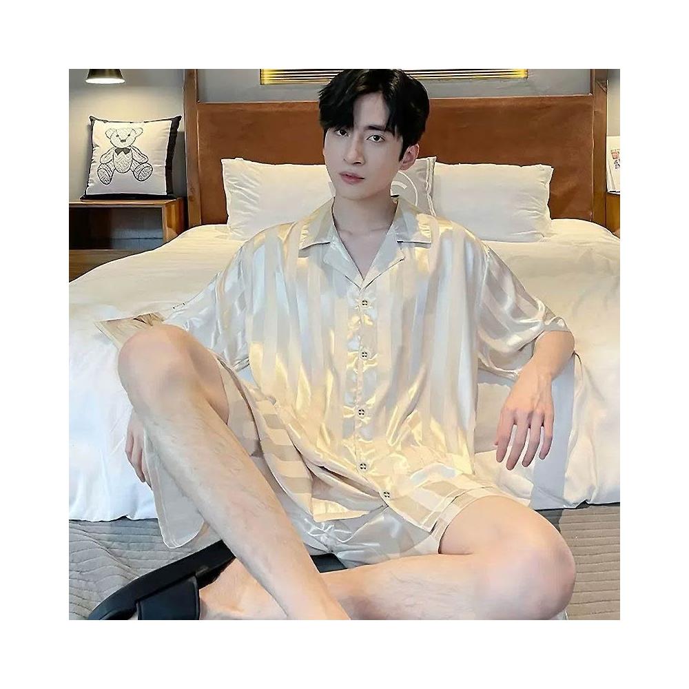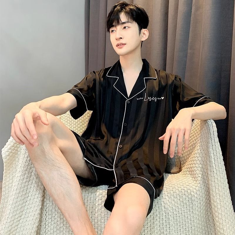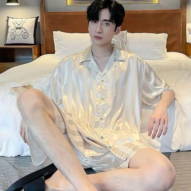 雲溪 冰絲睡衣男夏季短袖冰雪絲條紋新款家居服薄款仿絲綢套裝襯衣睡袍