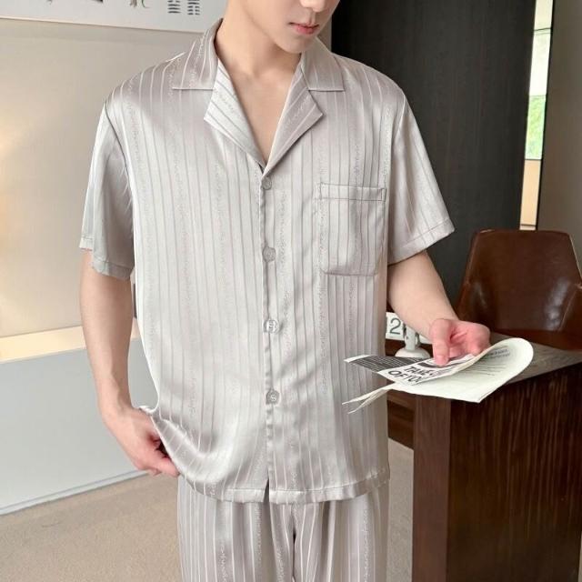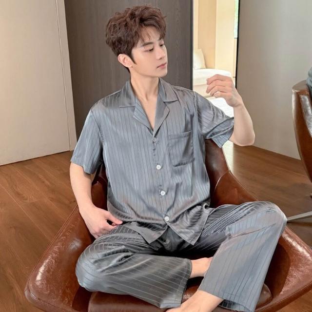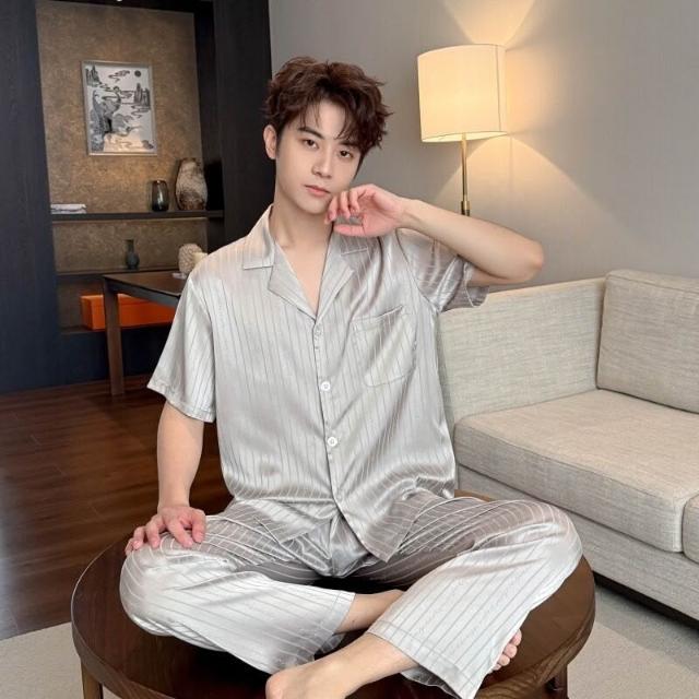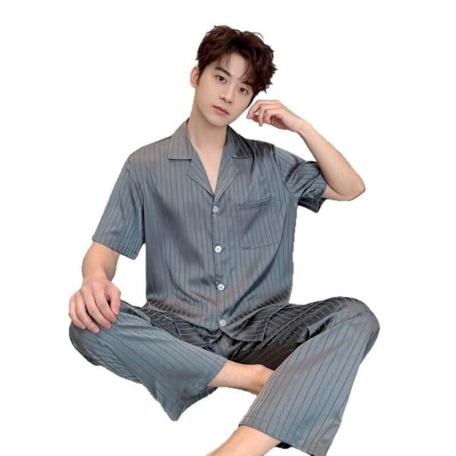 雲溪 男款100%絲綢睡衣家居服套裝夏季薄款·暗花條紋英文短袖長褲套裝