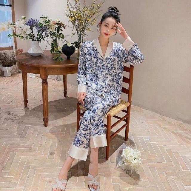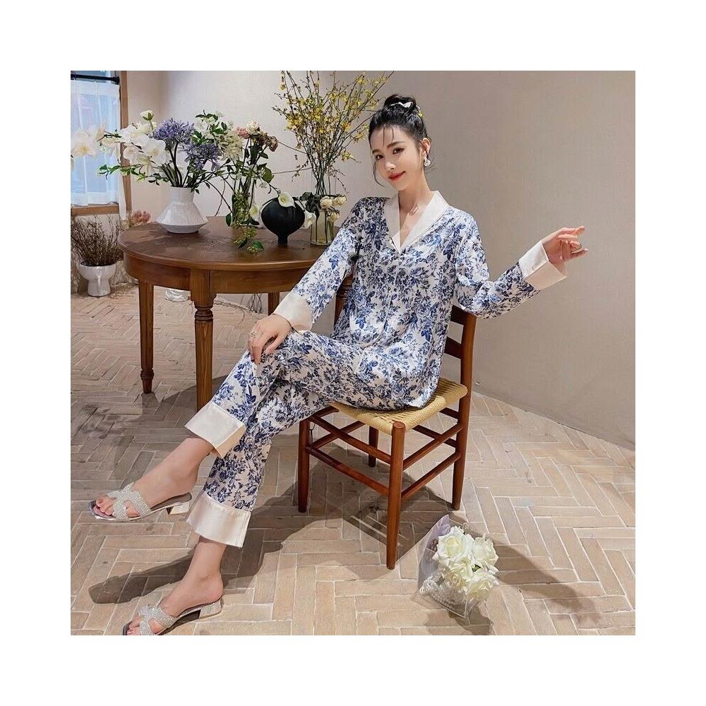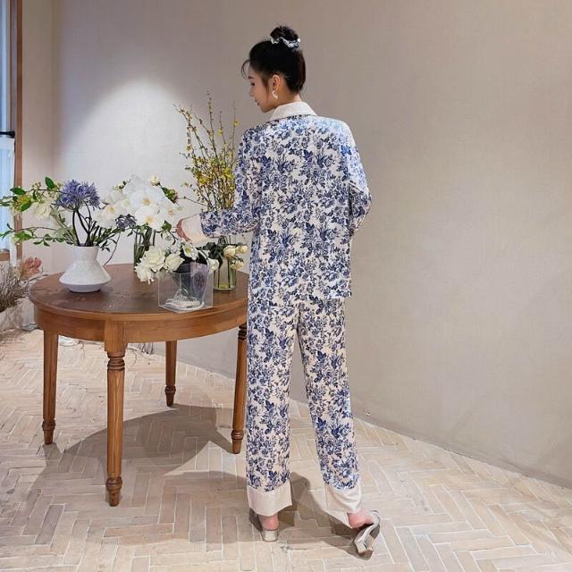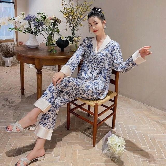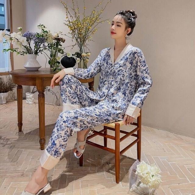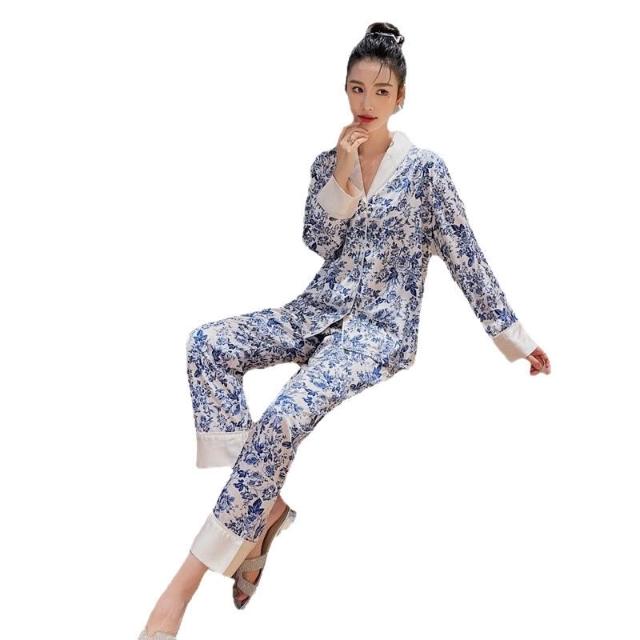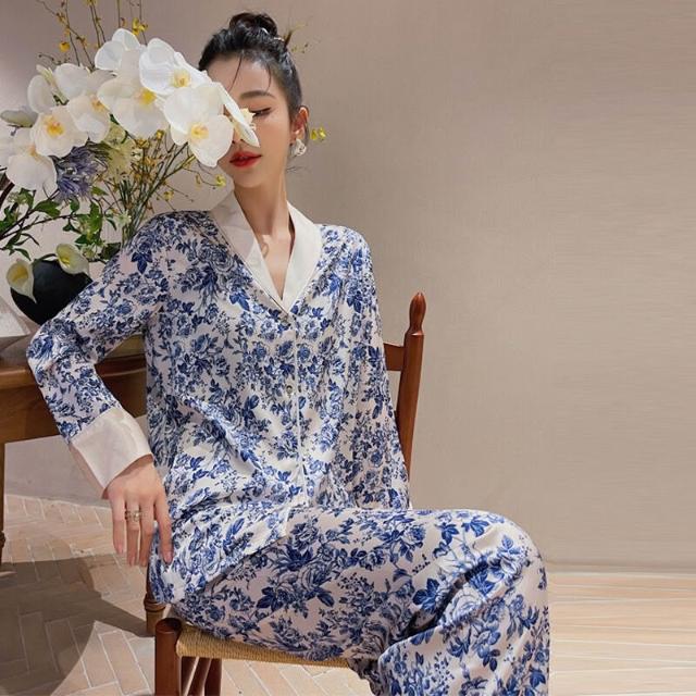雲溪 冰絲睡衣女2025年春秋季長袖長褲套裝古風版開衫家居服新款青花瓷