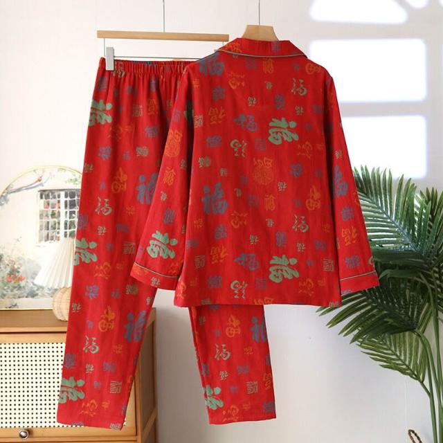 雲溪 春秋四季款雙面提花家居服薄款色織雙層棉紗長袖長褲喜慶大碼睡衣