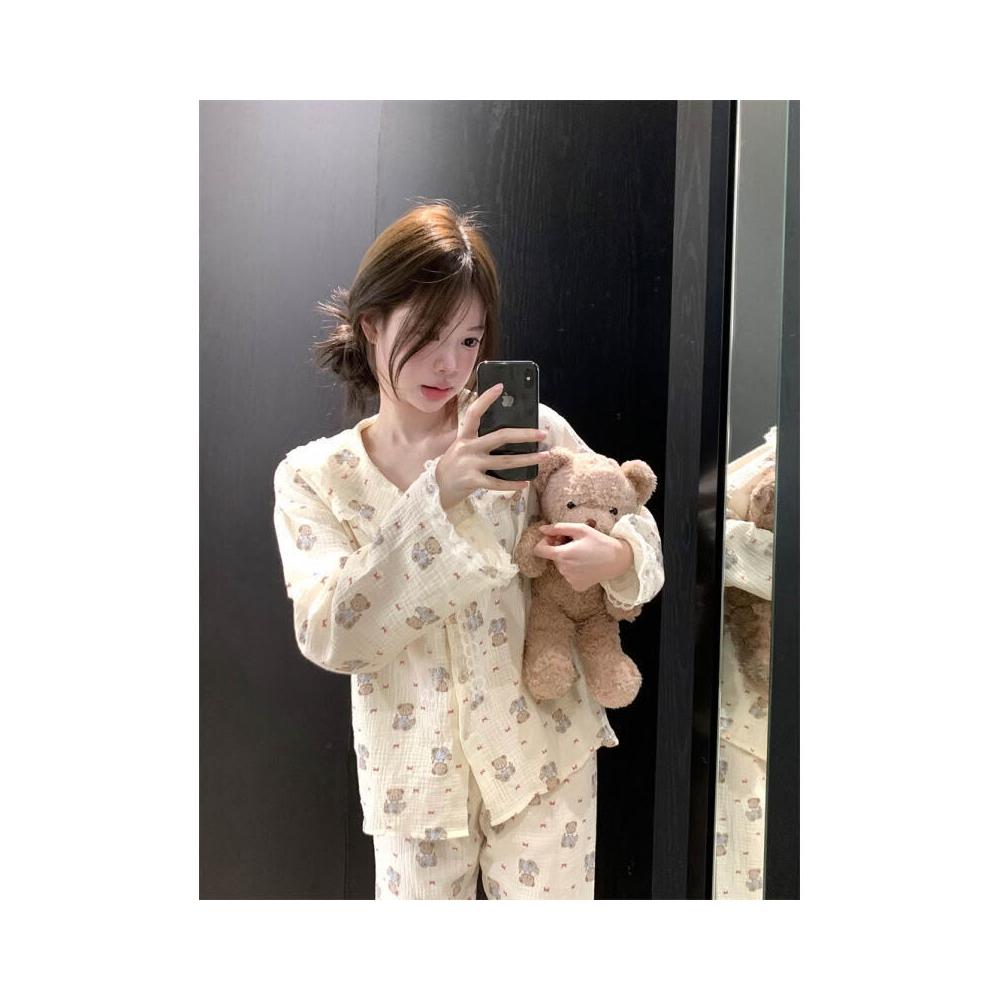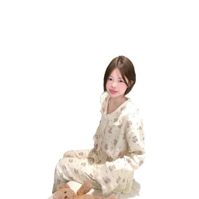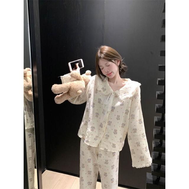 雲溪 chic可愛蝴蝶結小熊翻領花邊家居服睡衣套裝