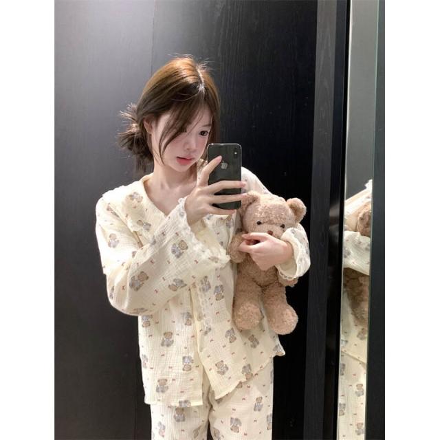 雲溪 chic可愛蝴蝶結小熊翻領花邊家居服睡衣套裝