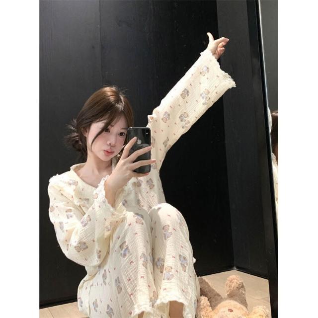 雲溪 chic可愛蝴蝶結小熊翻領花邊家居服睡衣套裝