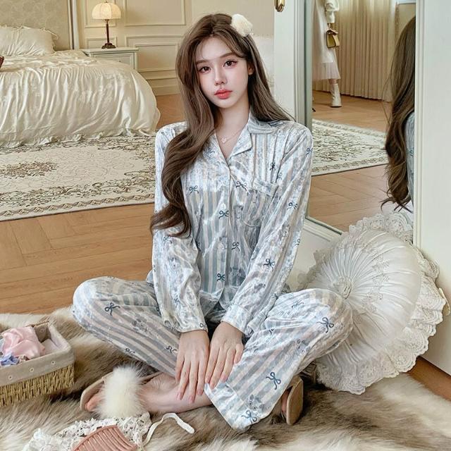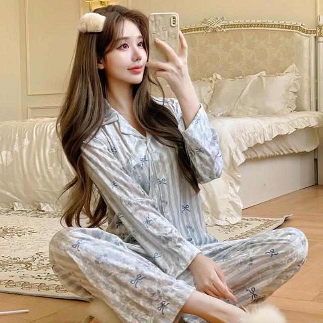 雲溪 2025新款金絲絨睡衣夢中情貓女長袖長褲藍色條紋蝴蝶印花舒適家居