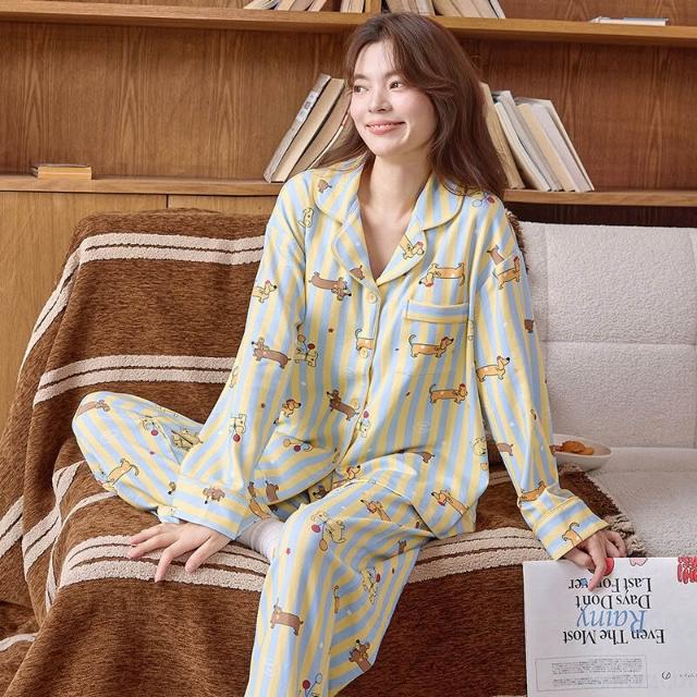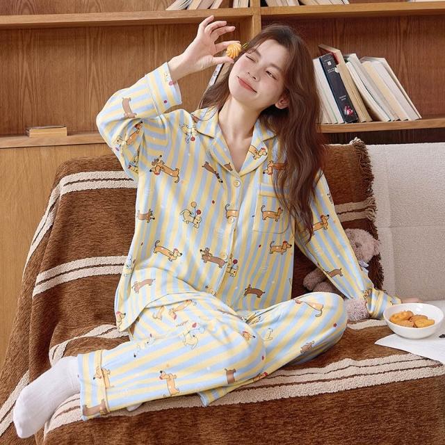 雲溪 新款棉質睡衣女秋季長袖開衫翻領甜美可愛卡通可外穿家居服套裝春