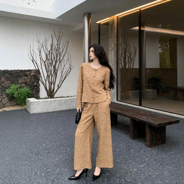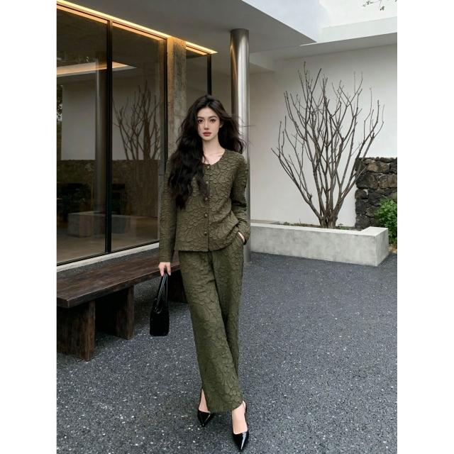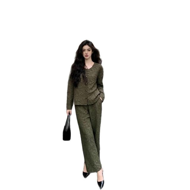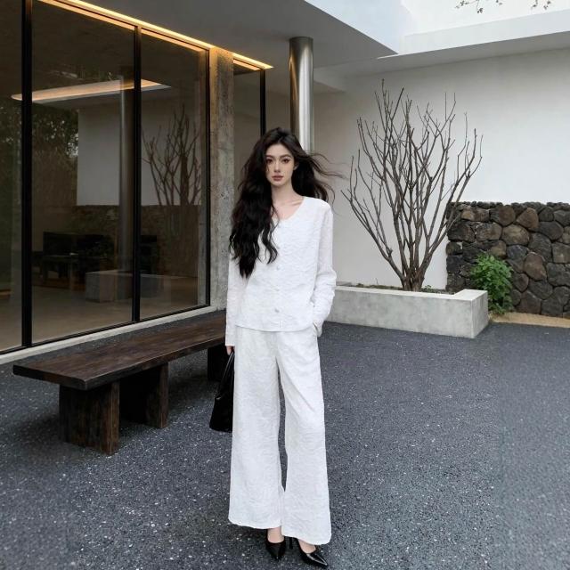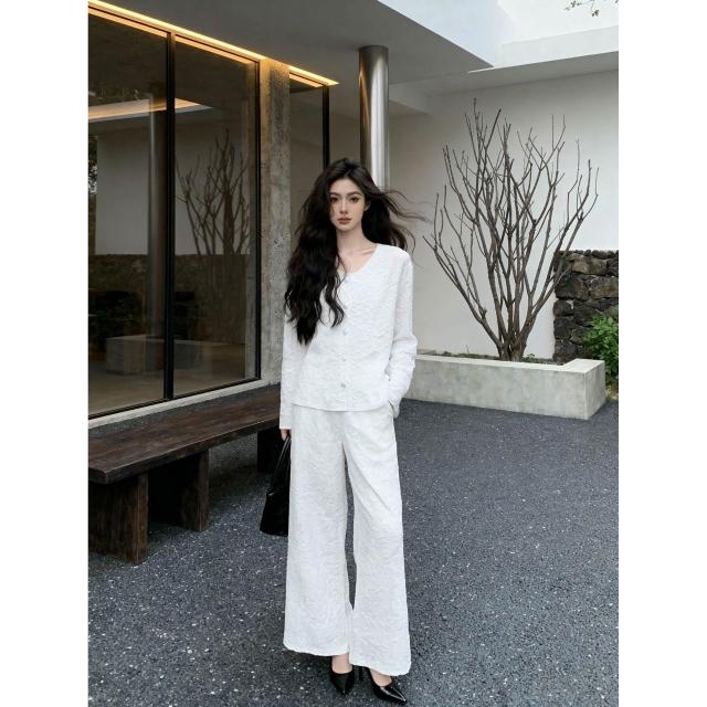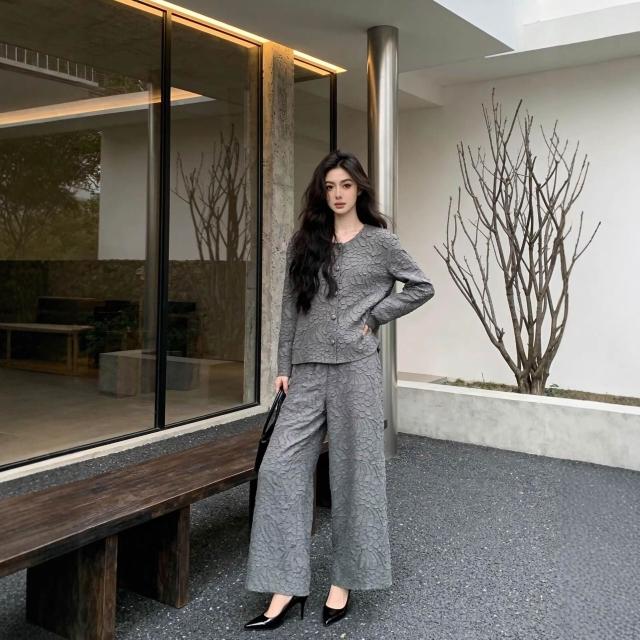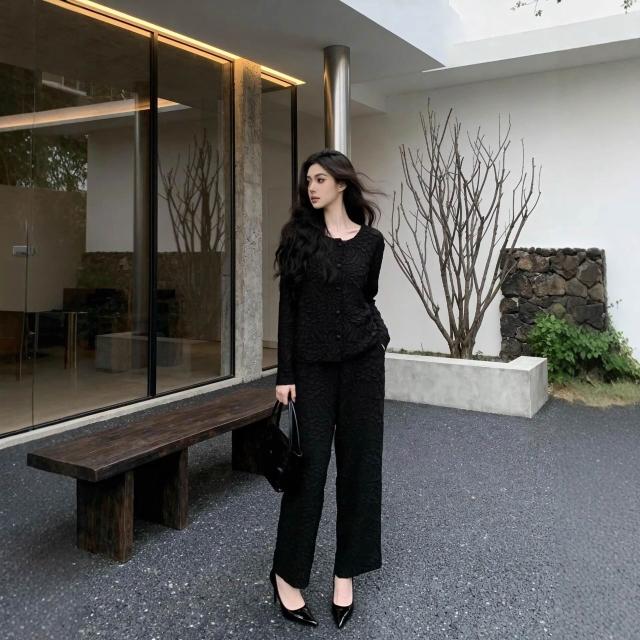 雲溪θ 氣質優雅通勤開衫上衣褲子套裝重工國風外套女盤扣三宅褶皺女裝