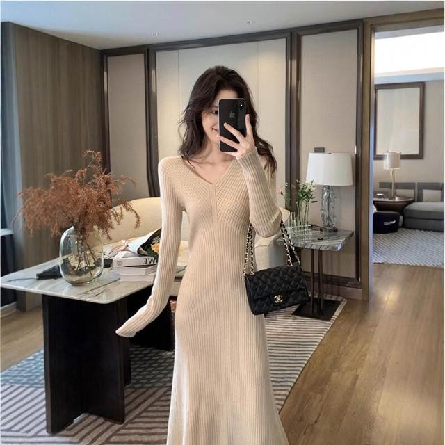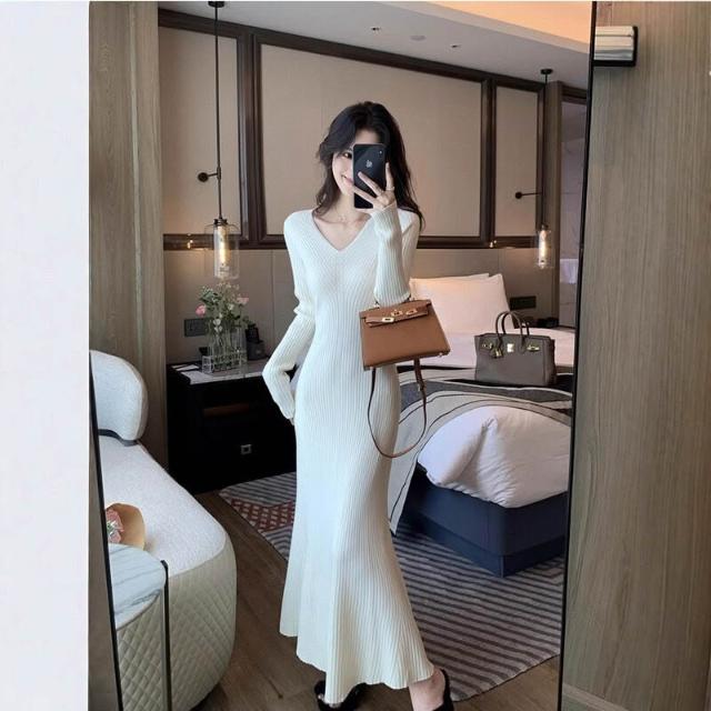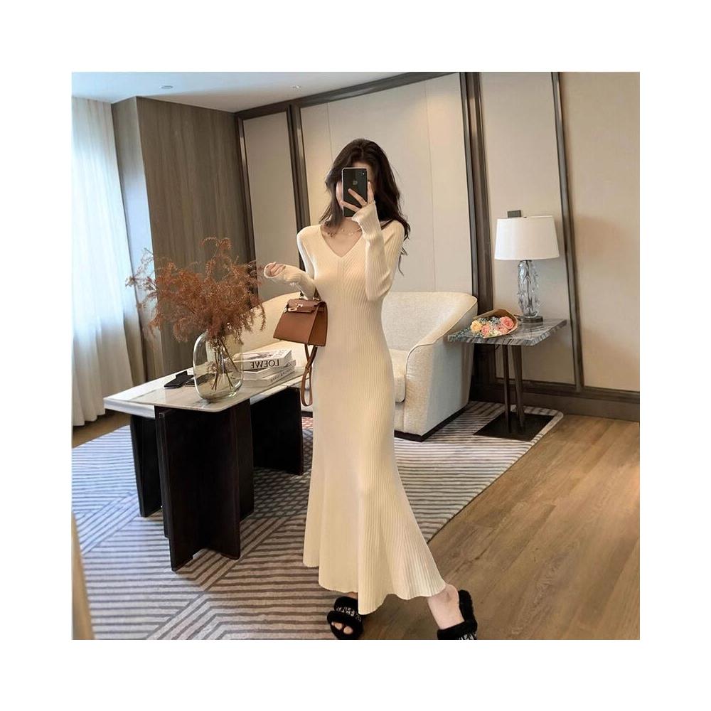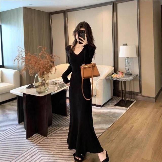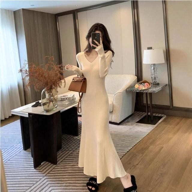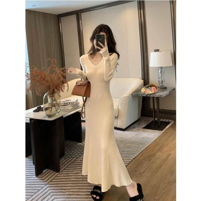 $雲溪$ 魚尾打底針織連衣裙子女春秋長款氣質內搭配大衣修身包臀毛衣長裙