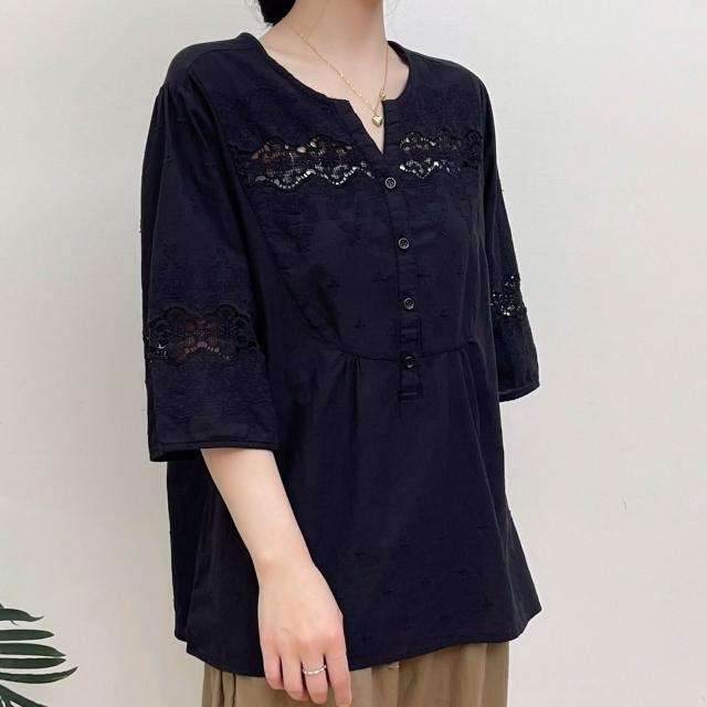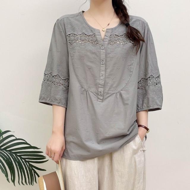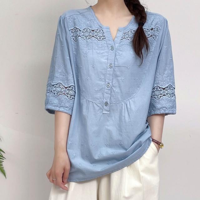 雲溪 日系清新森女刺繡镂空純棉襯衫女文藝百搭七分袖套頭上衣夏季襯衣