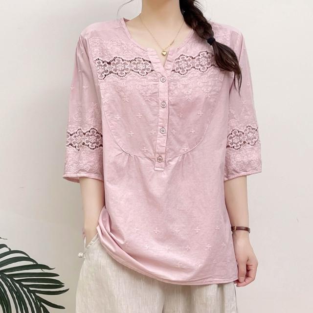 雲溪 日系清新森女刺繡镂空純棉襯衫女文藝百搭七分袖套頭上衣夏季襯衣