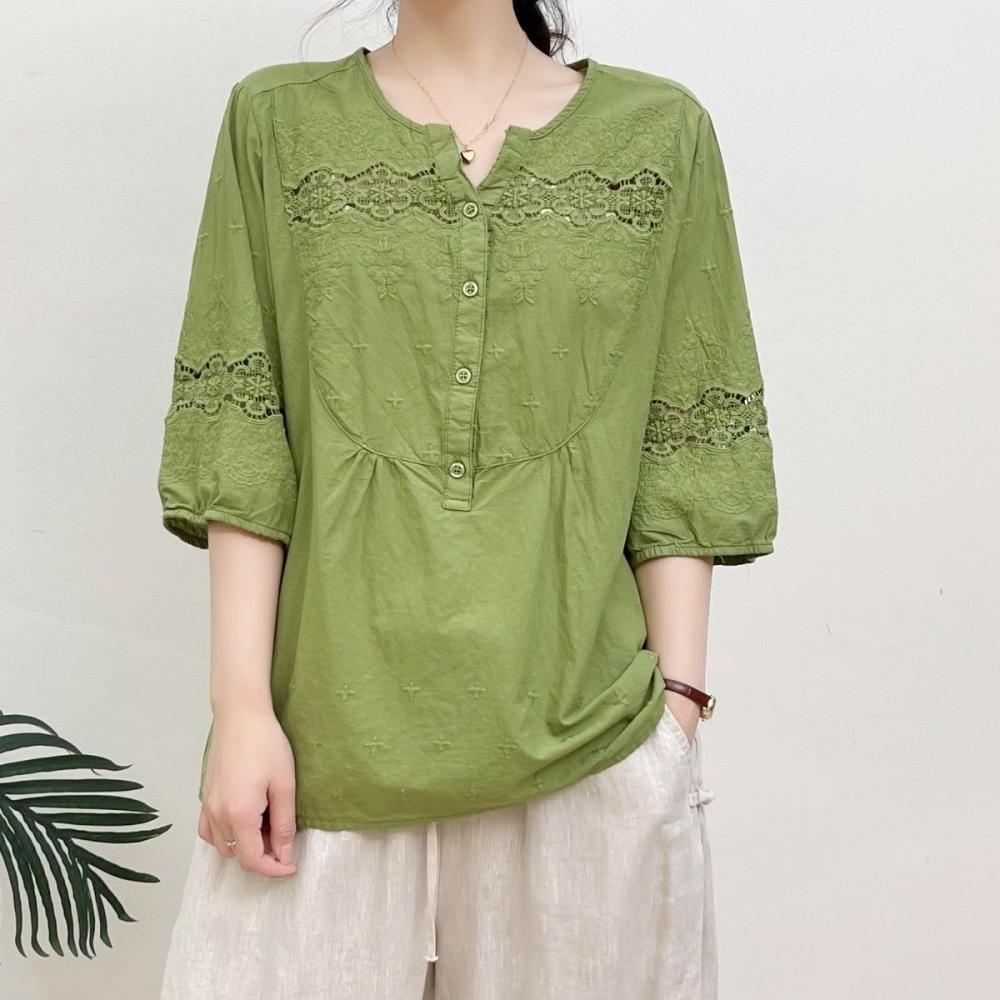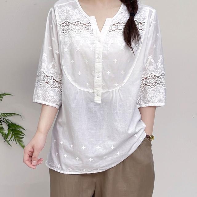 雲溪 日系清新森女刺繡镂空純棉襯衫女文藝百搭七分袖套頭上衣夏季襯衣