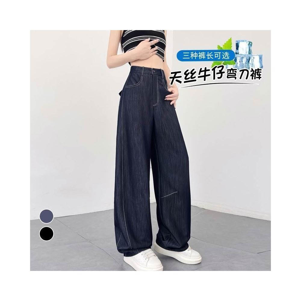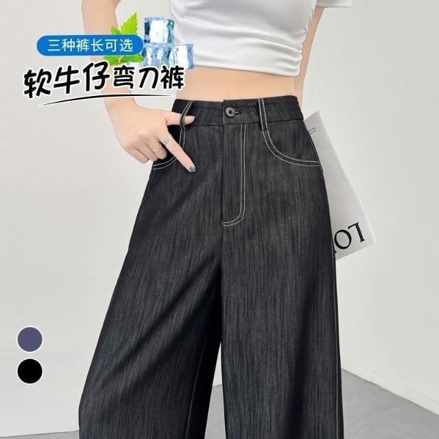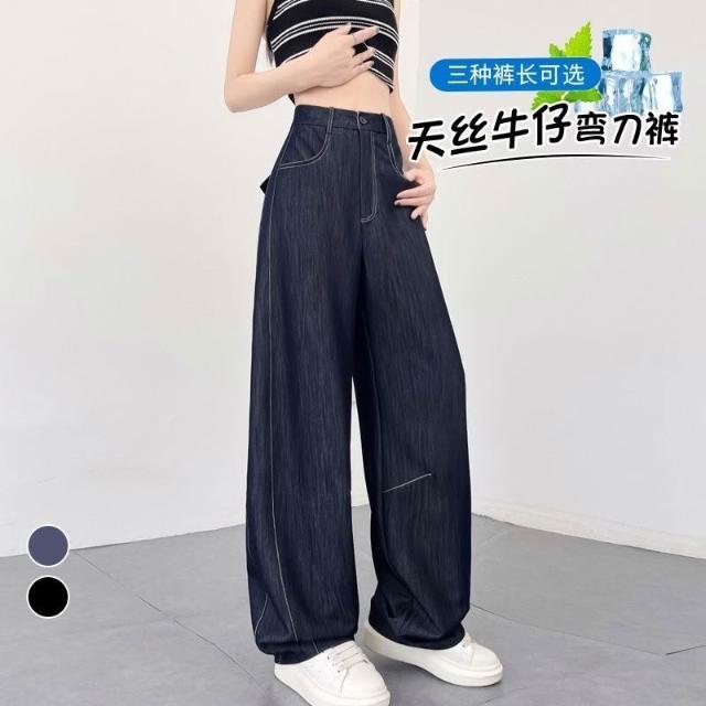 雲溪 深藍色天絲軟牛仔彎刀褲女夏季薄款鐮刀褲遮跨顯瘦闊腿褲香蕉褲女