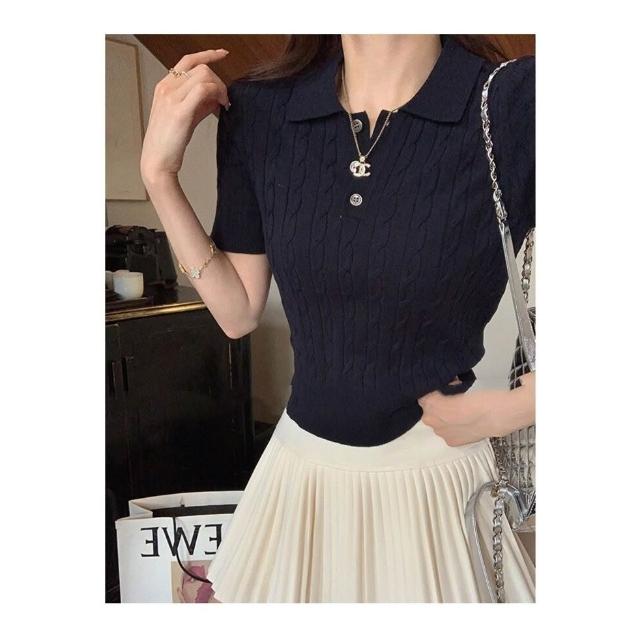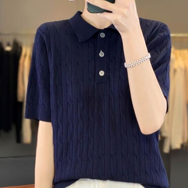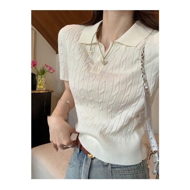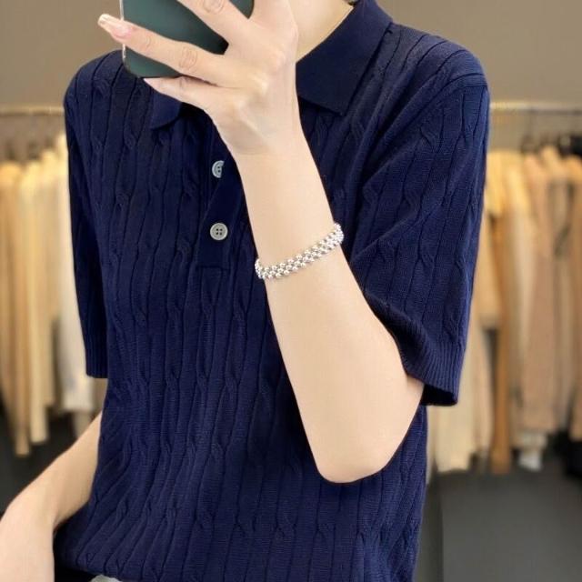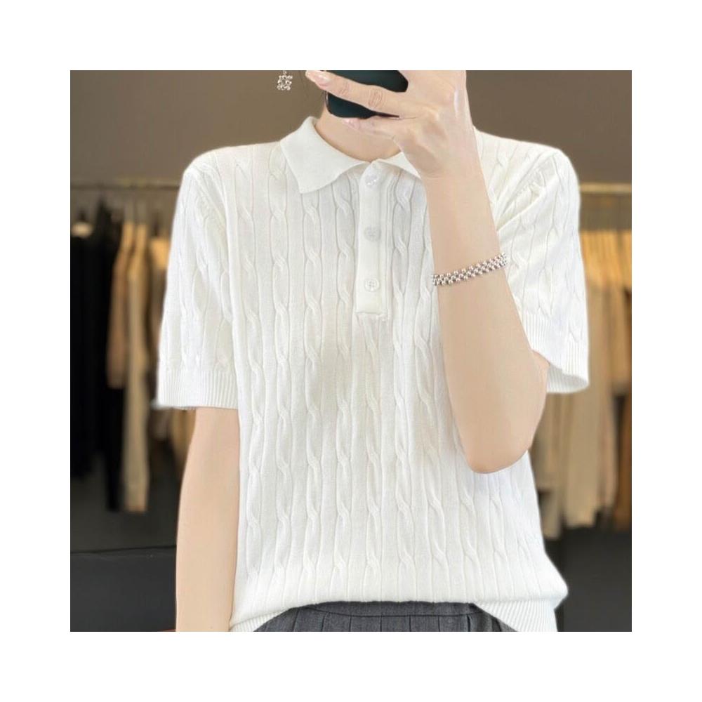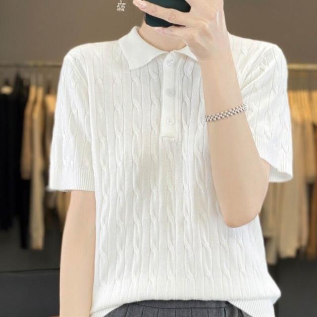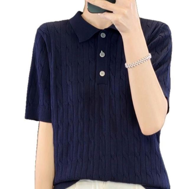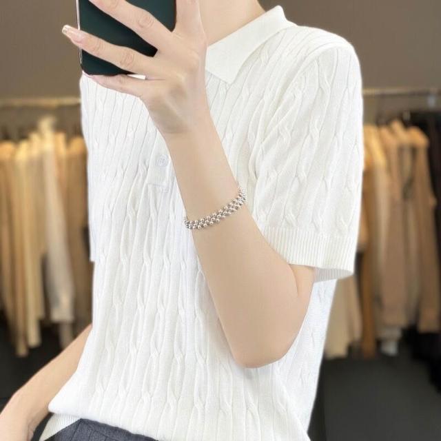 雲溪 老錢風麻花針織polo衫短袖女春夏新款簡約半袖針織衫翻領t恤上衣