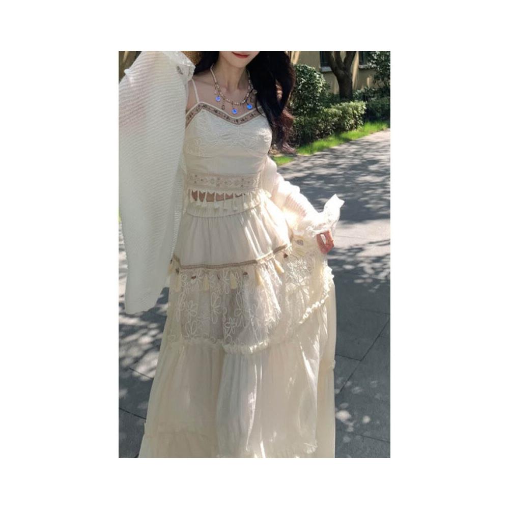 雲溪 波西米亞民族風流蘇吊帶背心防曬開衫三件套裝女夏蕾絲拼接半身裙
