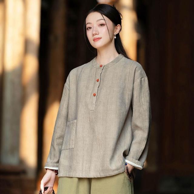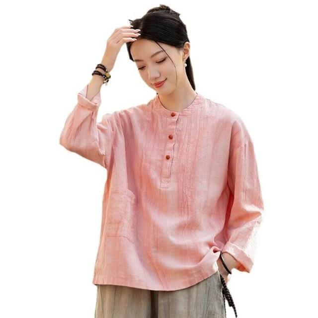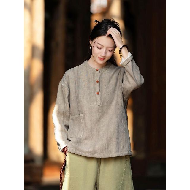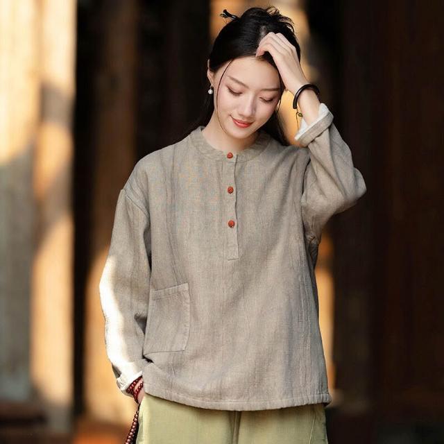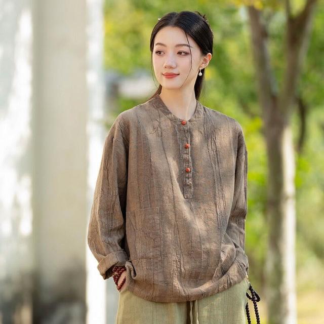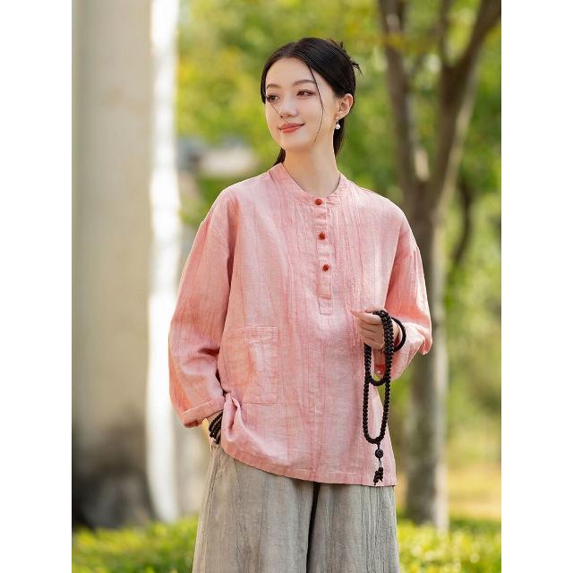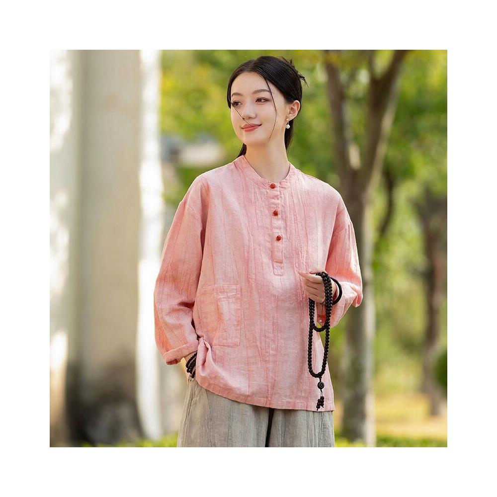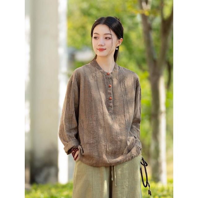 雲溪 26春季新款棉麻女裝中式復古立領紮染上衣女拼色盤扣長袖T恤襯衫