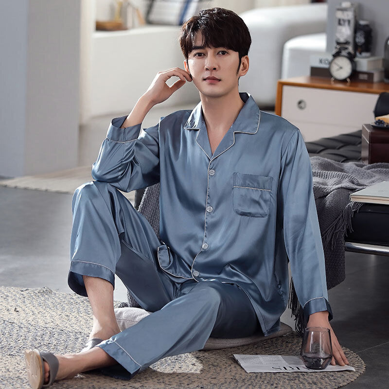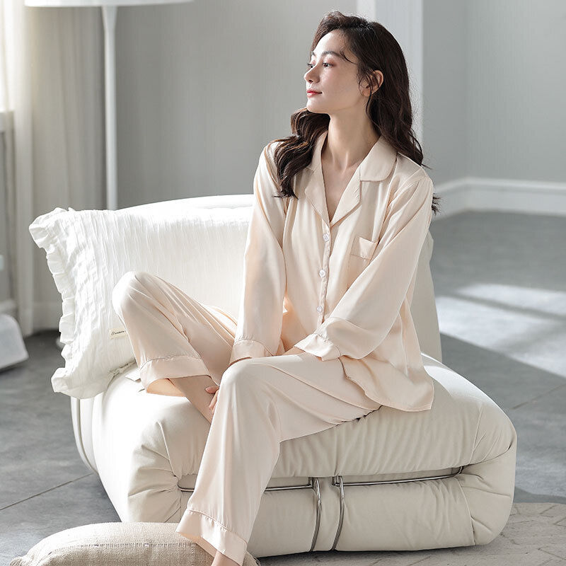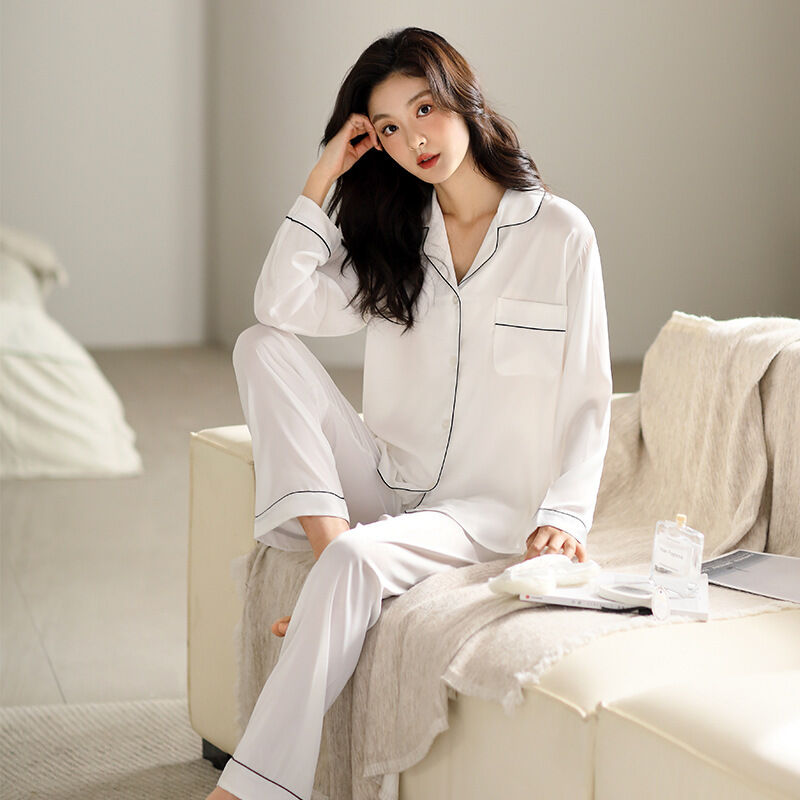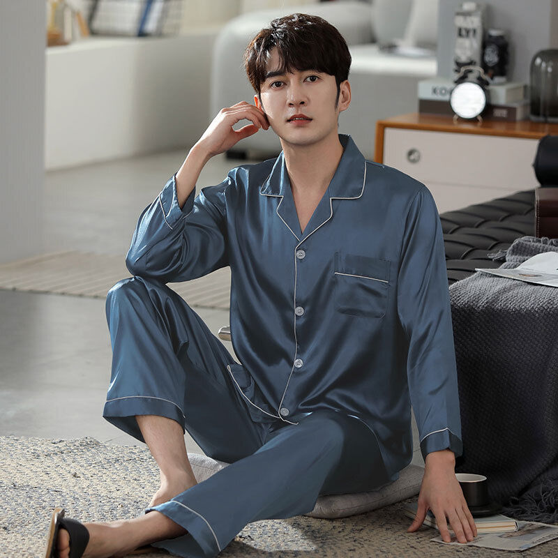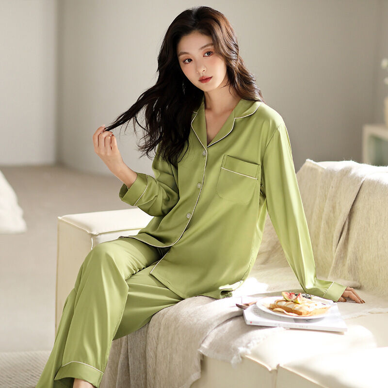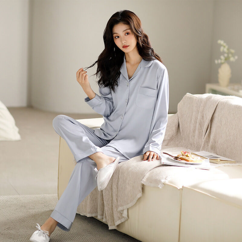 雲溪 緞面冰絲男士長袖長褲春夏純色家居服套裝女士秋季睡衣新品