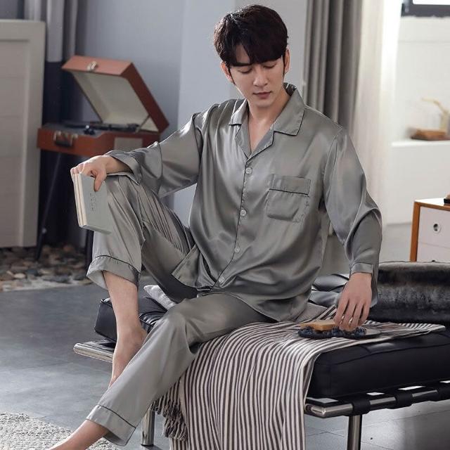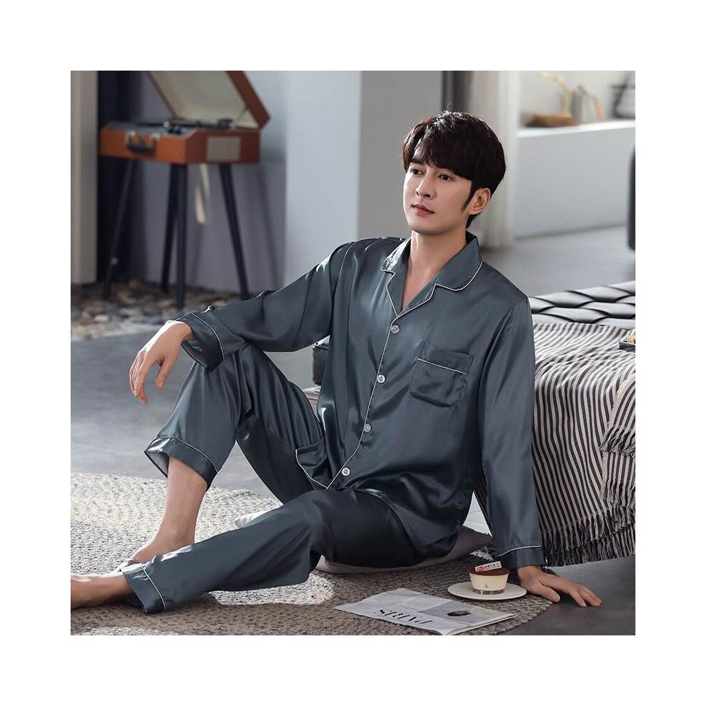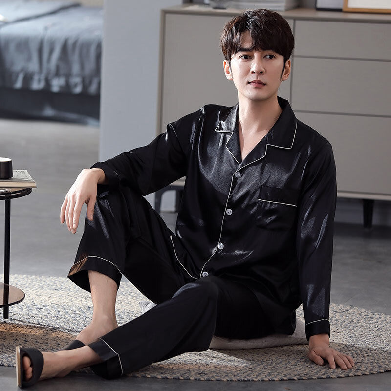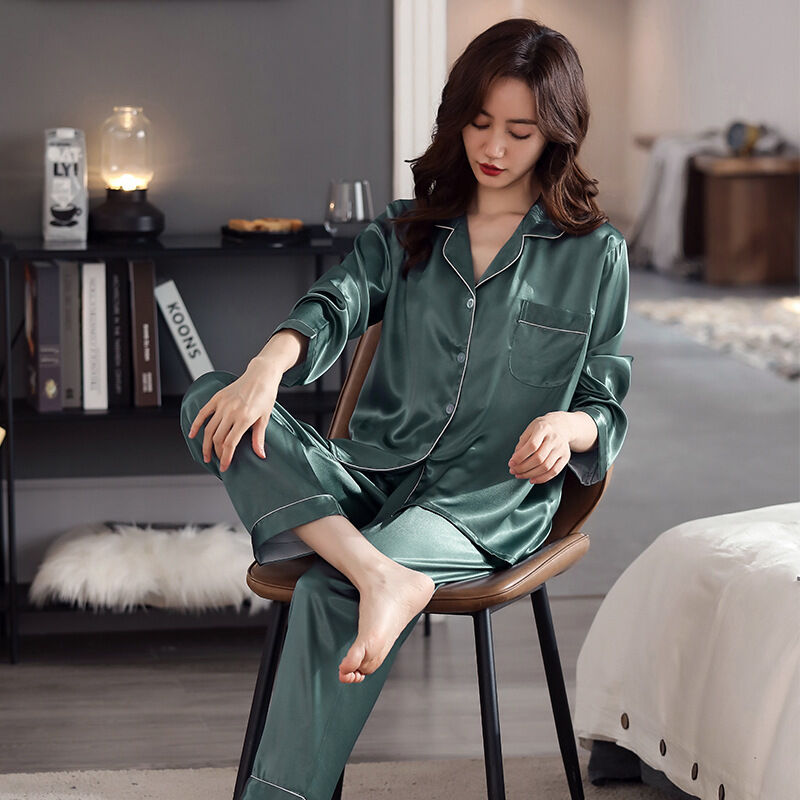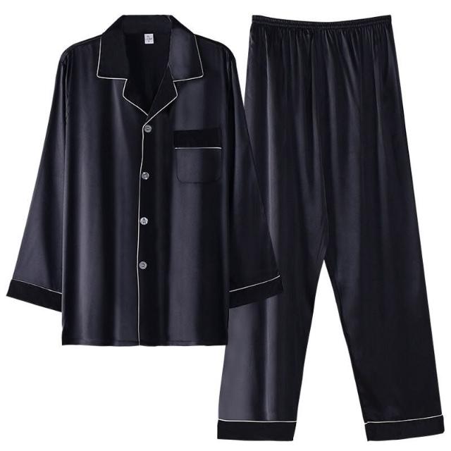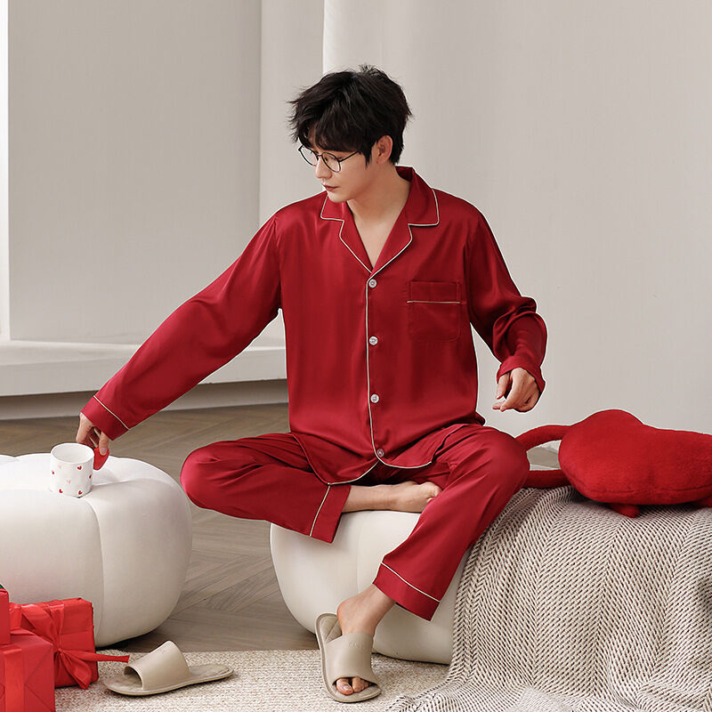 雲溪 緞面冰絲男士長袖長褲春夏純色家居服套裝女士秋季睡衣新品