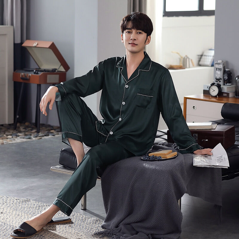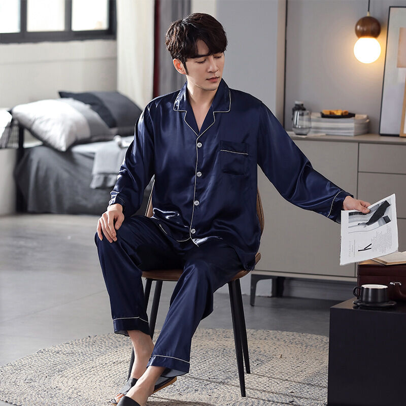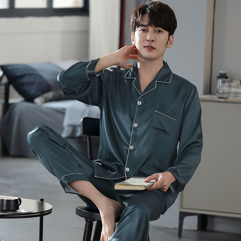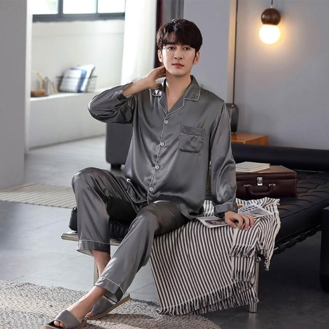 雲溪 緞面冰絲男士長袖長褲春夏純色家居服套裝女士秋季睡衣新品