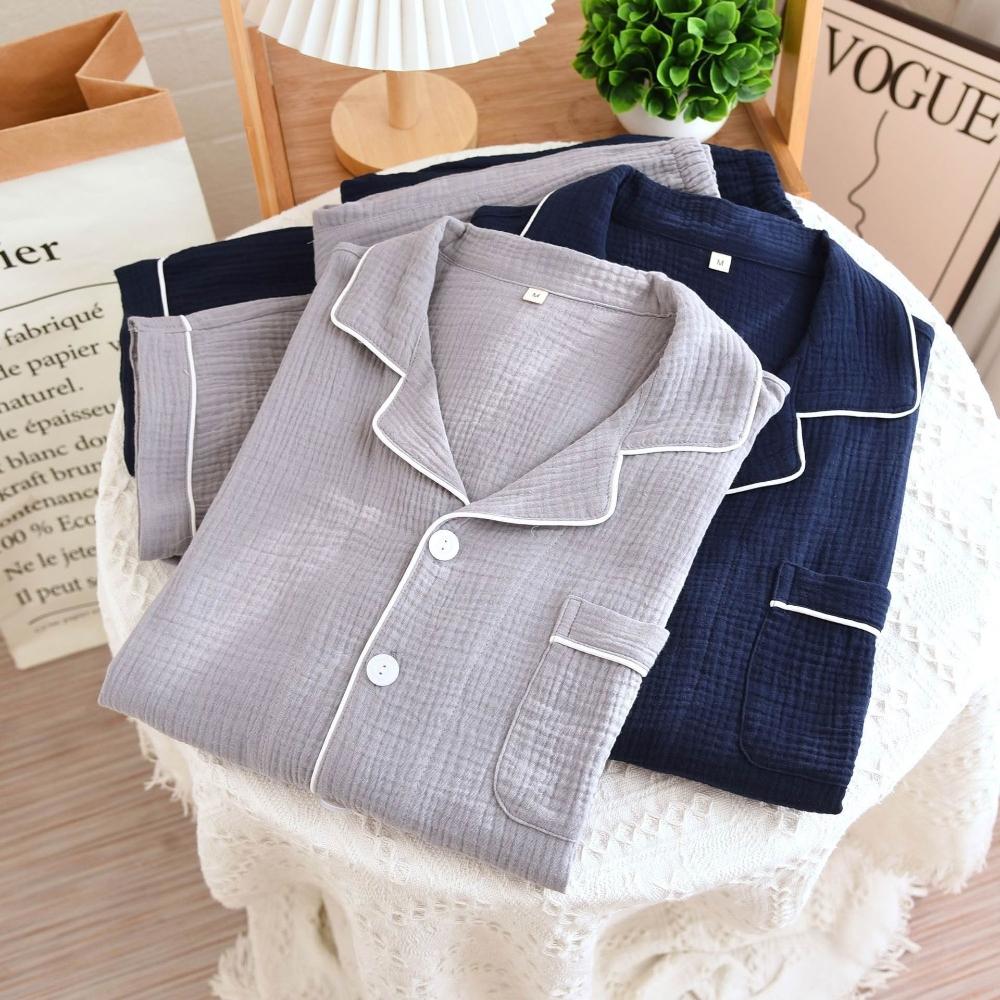 雲溪 绉布純色男士睡衣套裝 雙層棉紗休閑款家居服 春夏秋新款長袖長褲