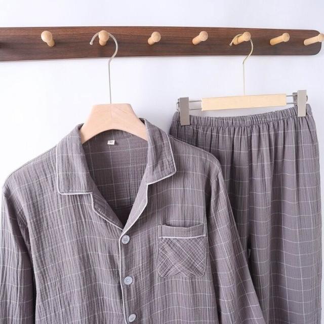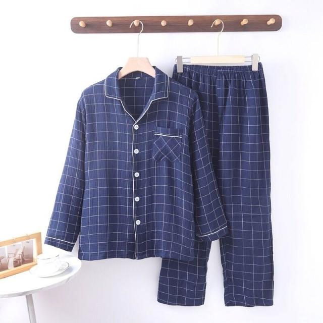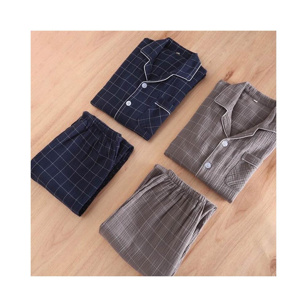 雲溪 春夏男士棉雙層紗布睡衣薄款绉布棉家居服绉布簡約格子藏青吸汗