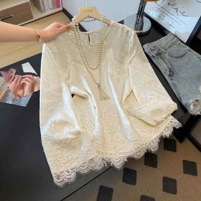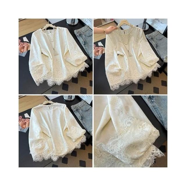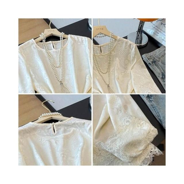 雲溪 新中式國風圓領緞面提花上衣女蕾絲拼接長袖寬松內搭打底小衫白色