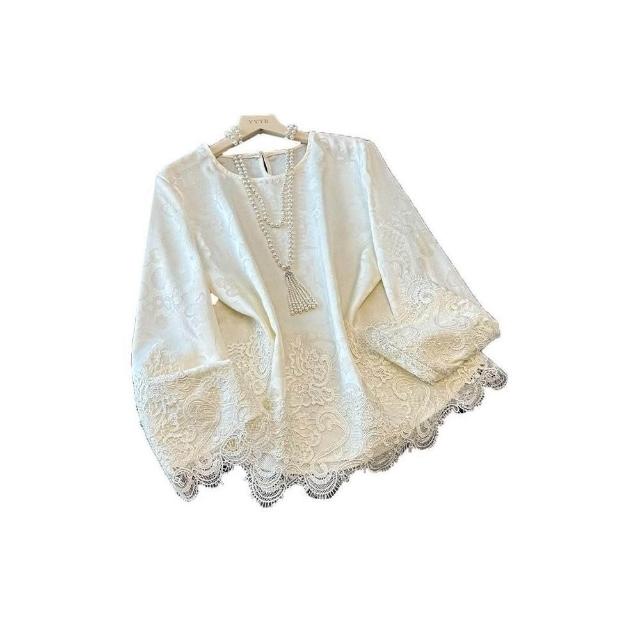 雲溪 新中式國風圓領緞面提花上衣女蕾絲拼接長袖寬松內搭打底小衫白色