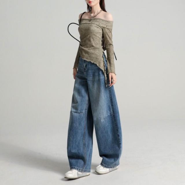 松弛感彎刀牛仔褲女2026春裝新款調性寬松慵懶風顯瘦拖地長褲