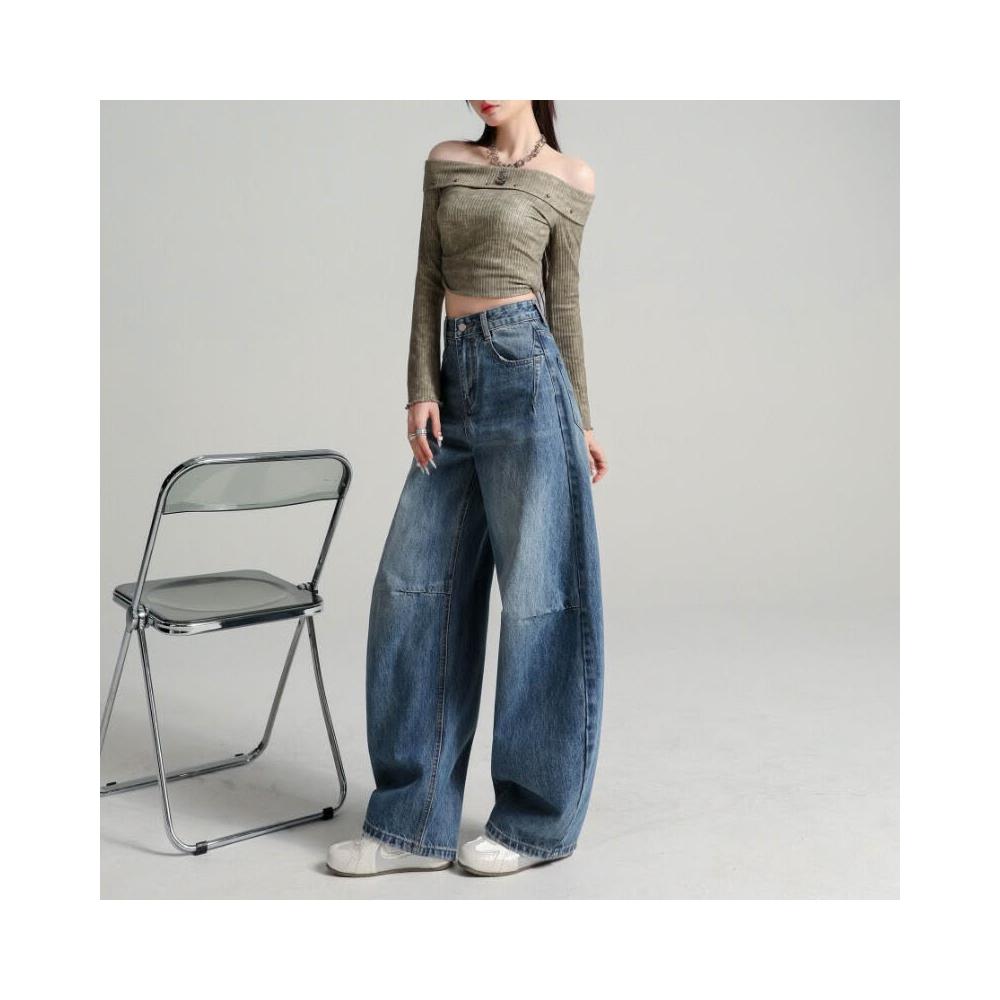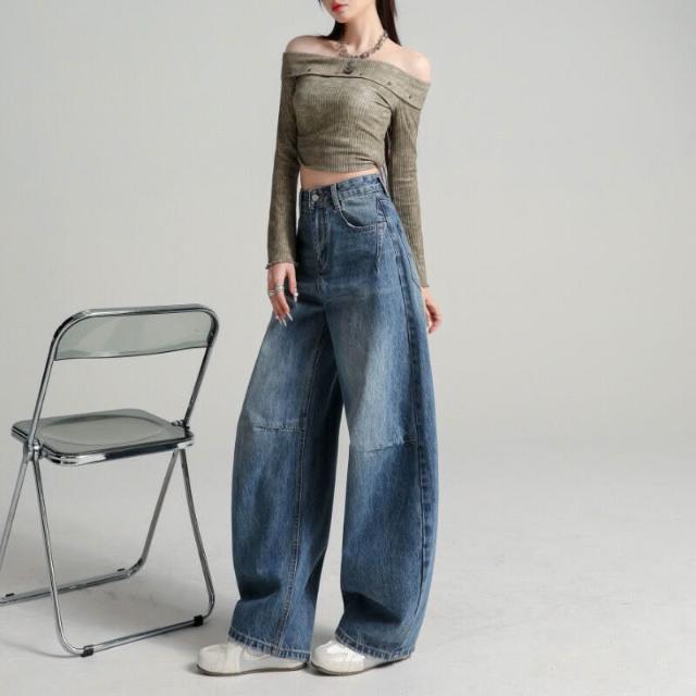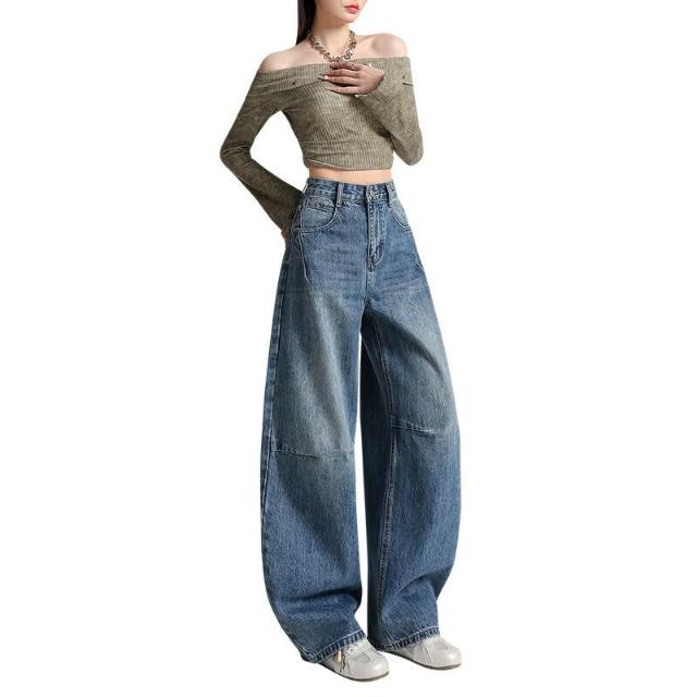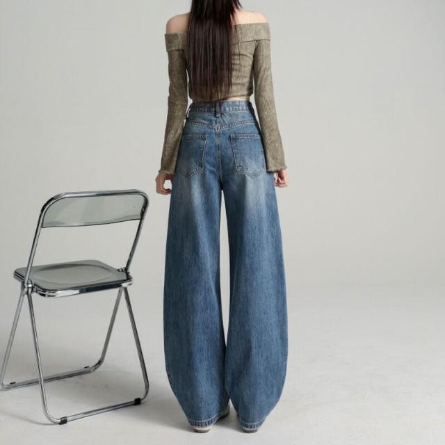 松弛感彎刀牛仔褲女2026春裝新款調性寬松慵懶風顯瘦拖地長褲