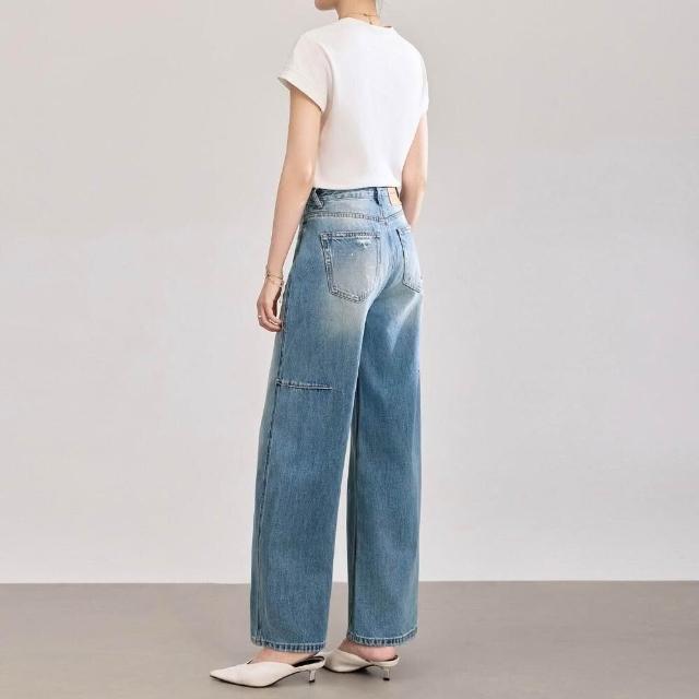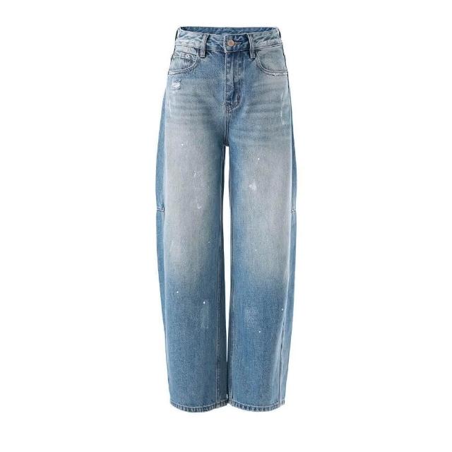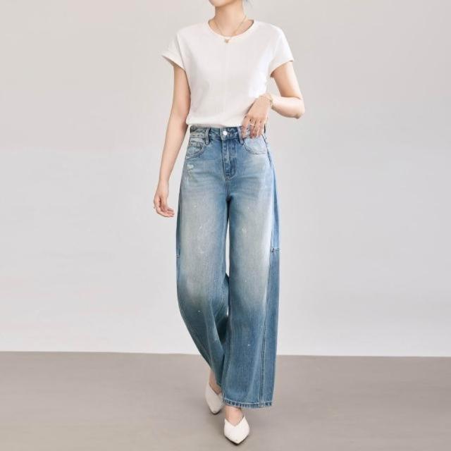 高腰彎刀寬松潑墨水洗闊腿牛仔褲女春夏新款下裝