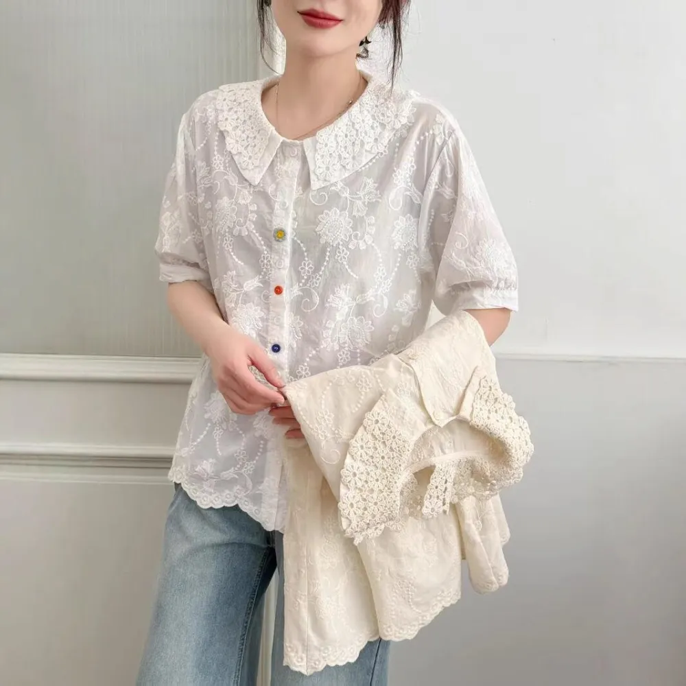 娃娃領襯衫女夏季新款時尚百搭寬松顯瘦減齡短袖上衣薄款小衫