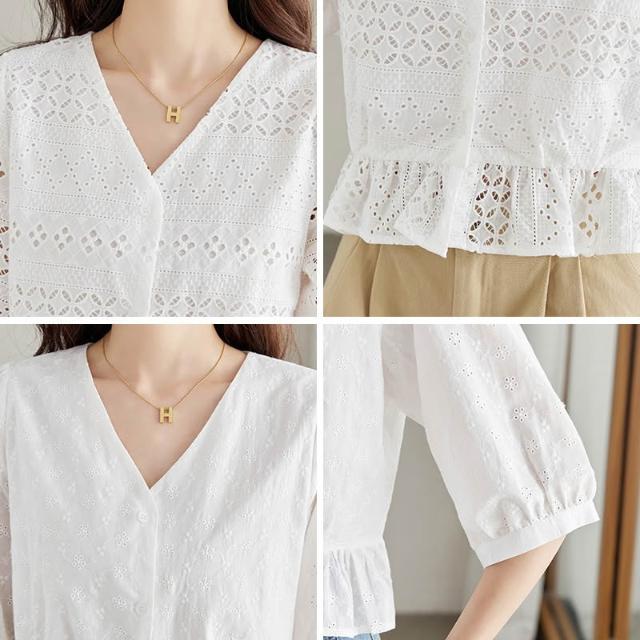 繡花镂空白襯衫女五分袖2026夏季小個子短款上衣純棉v領襯衣