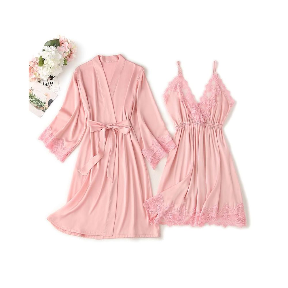 性感吊帶睡袍兩件套 帶花邊仿真絲家居服睡衣女春夏