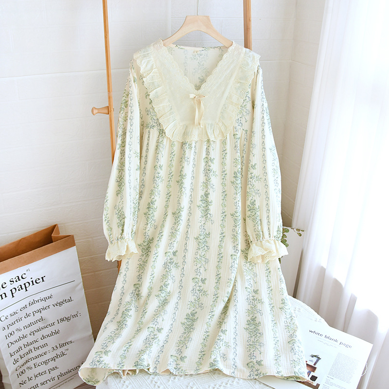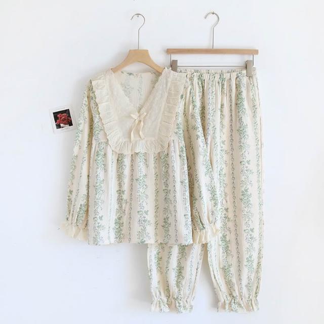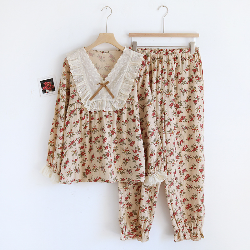 雲溪 绉布復古蕾絲V領純棉睡衣 雙層紗春秋女士長袖長褲 家居服睡褲套裝