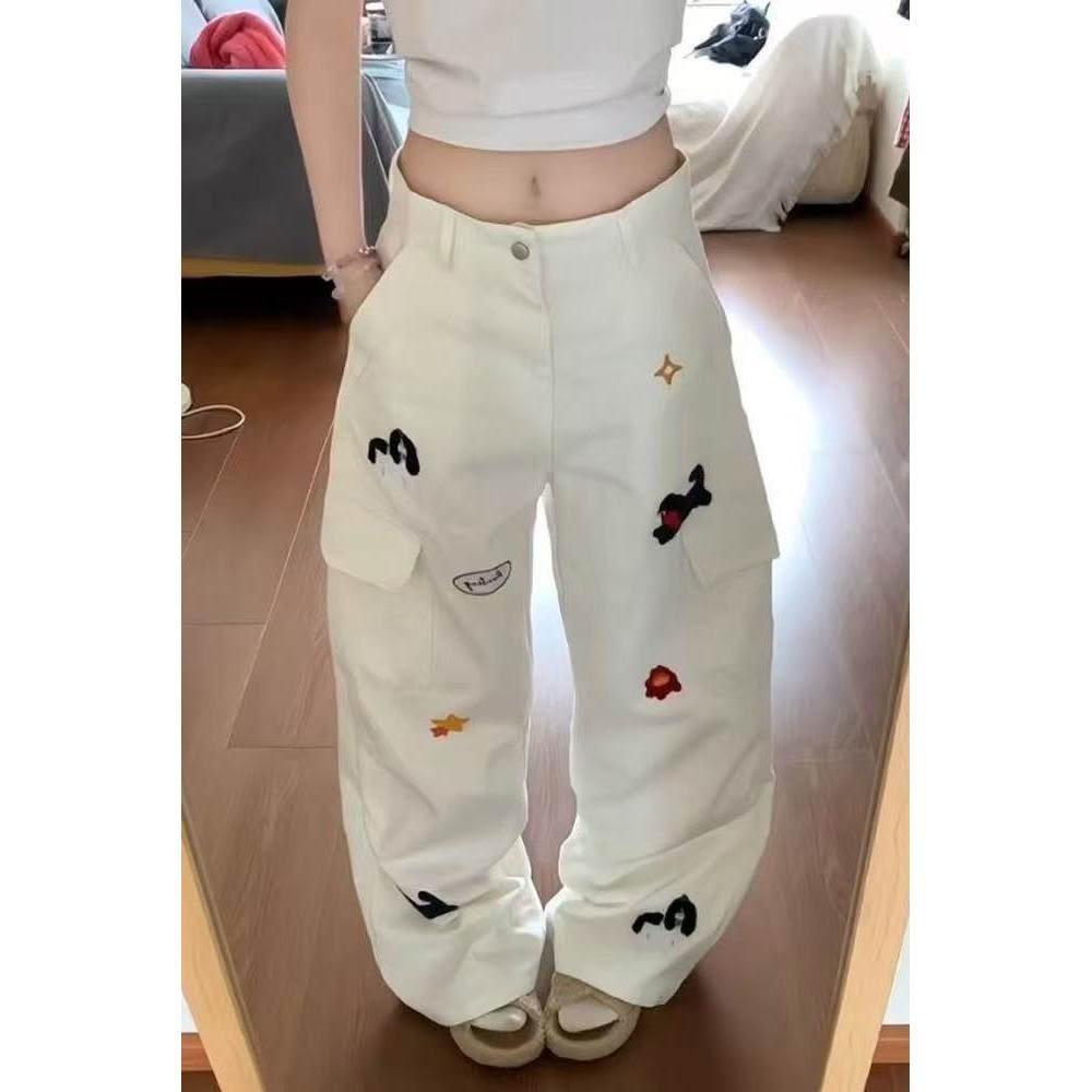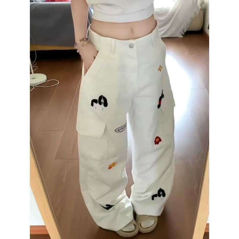 彬彬甄選美式復古刺繡白色設計感工裝牛仔褲女夏季高街直筒寬鬆顯瘦闊腿褲