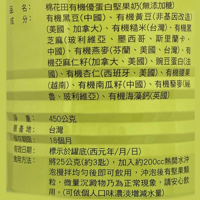 Cotton Field Health Stores 棉花田有機優蛋白堅果奶(無糖)-2罐組(450g/罐)