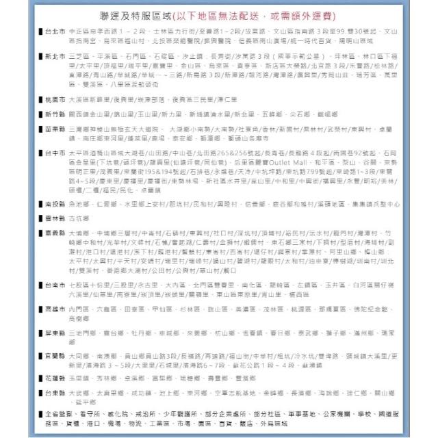 - 針對大型商品(包括:大型家電、家具床墊、健身按摩器材、車類...等),商店將於完成收款確認後,一天內〈不含例假日〉將會有專人與您確認相關配送細節等的聯繫。偏遠地區、樓層費及其它加價費用,皆由商店於約定配送時一併告知,商店將保留出貨與否的權利。