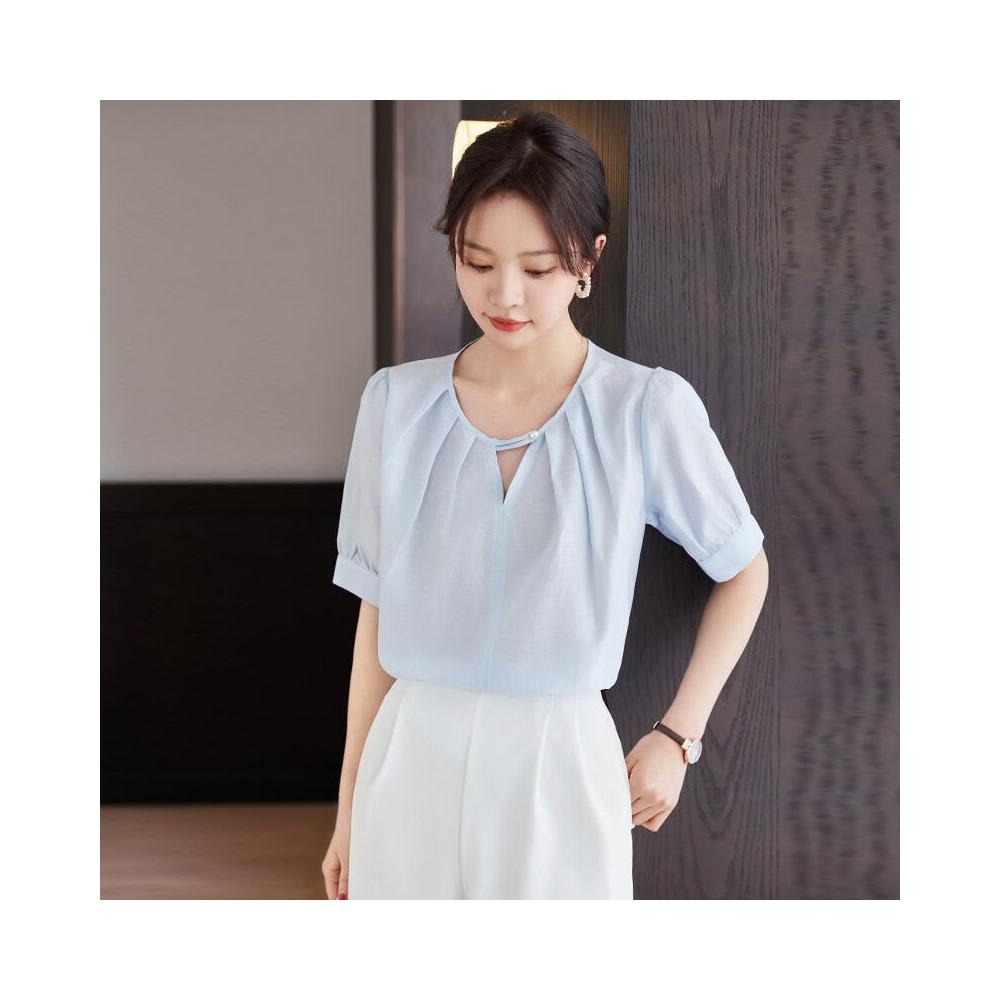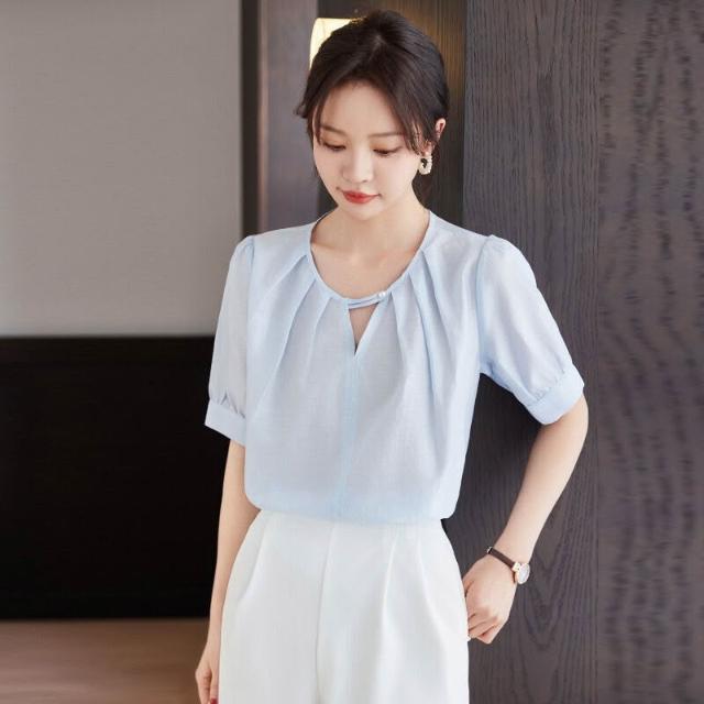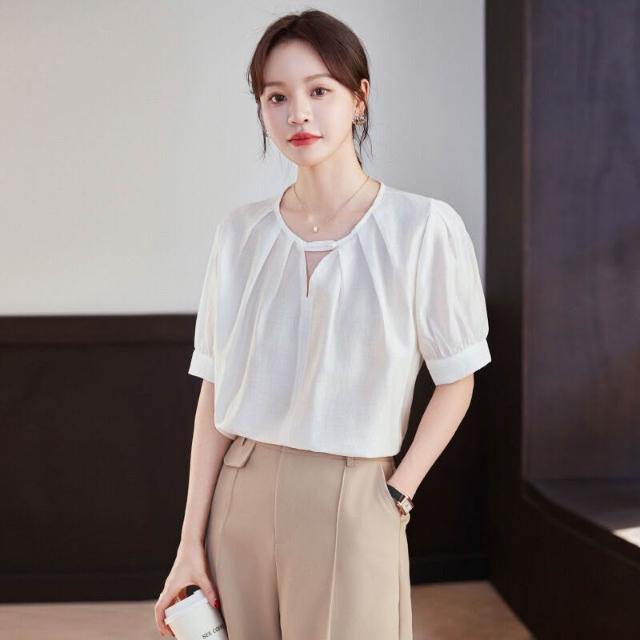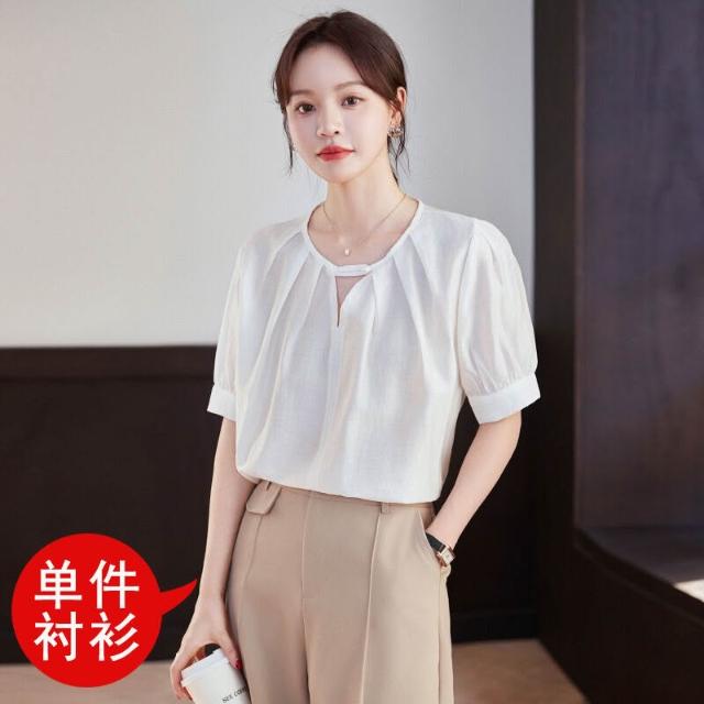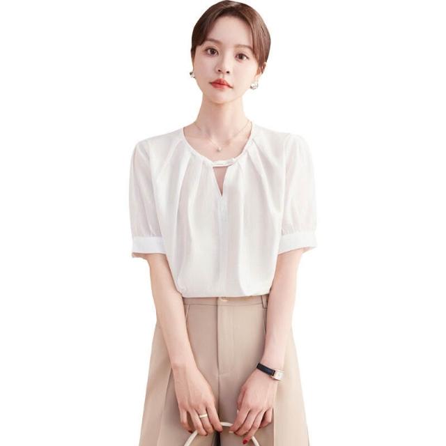 木槿衣坊 夏季新款氣質圓領小襯衣泡泡袖白色襯衫女短袖雪紡上衣潮廠家批發 2