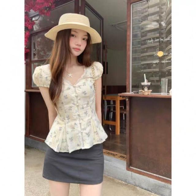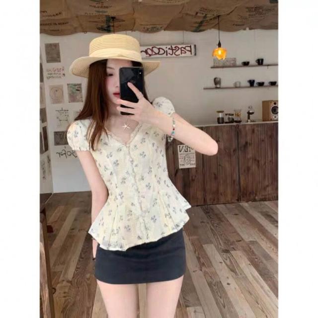 法式氣質碎花泡泡袖襯衫2025夏季辣妹小眾甜美蕾絲短袖上衣女