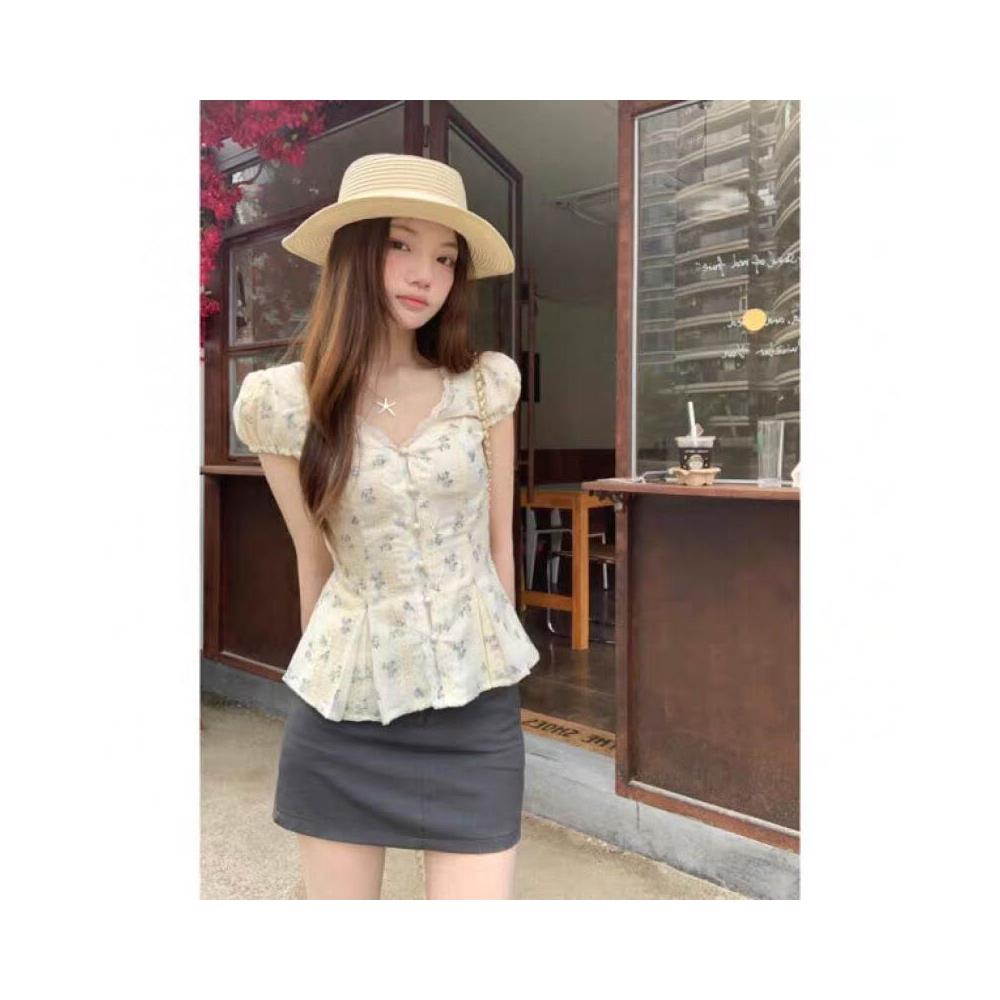 法式氣質碎花泡泡袖襯衫2025夏季辣妹小眾甜美蕾絲短袖上衣女