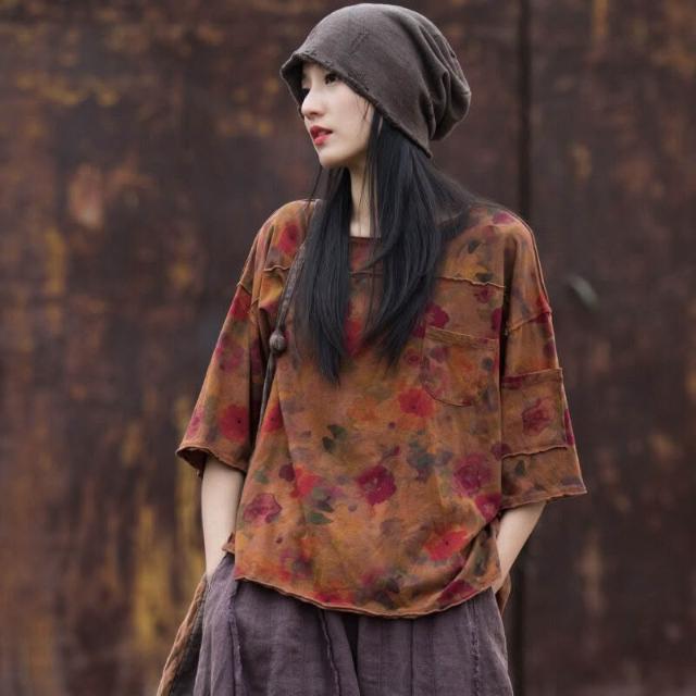 木槿衣坊 數碼印花砂洗做舊棉麻女裝新款專櫃品質短袖 恤文藝復古女上衣 97