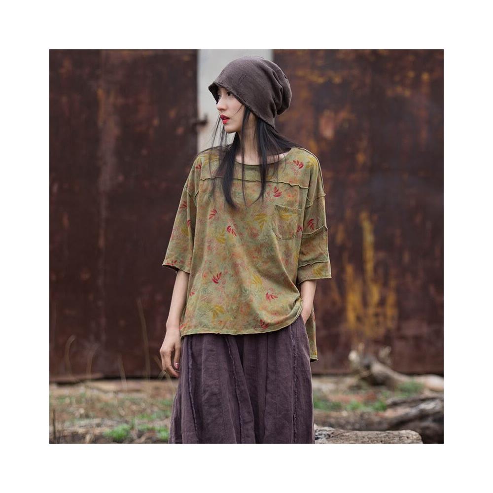 木槿衣坊 數碼印花砂洗做舊棉麻女裝新款專櫃品質短袖 恤文藝復古女上衣 97