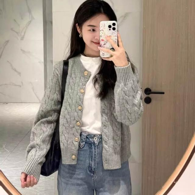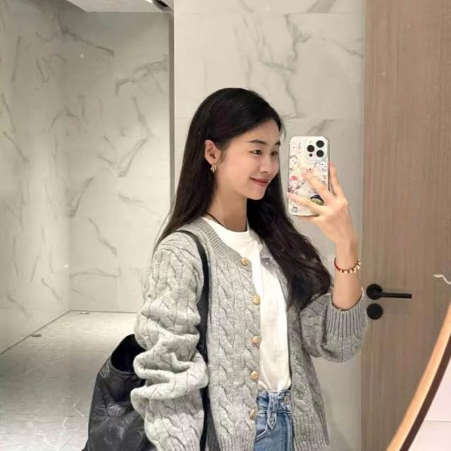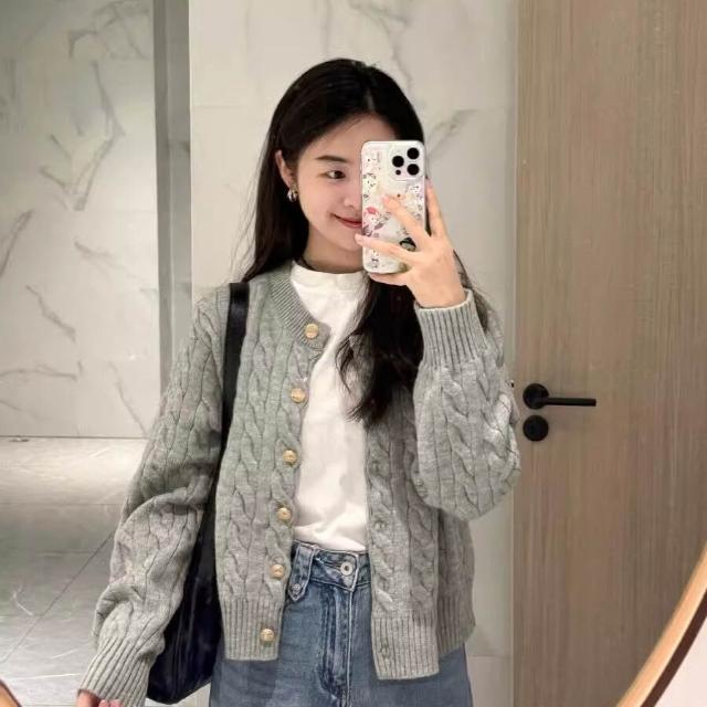 木槿衣坊 灰色麻花毛衣外套女春秋季2025新款感慵懶風短款針織開衫上衣