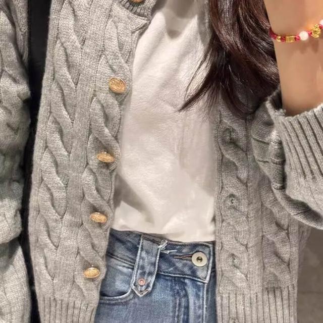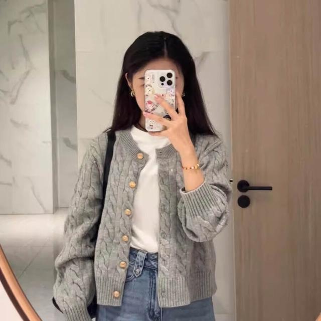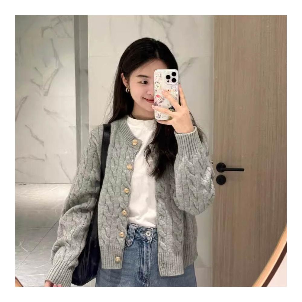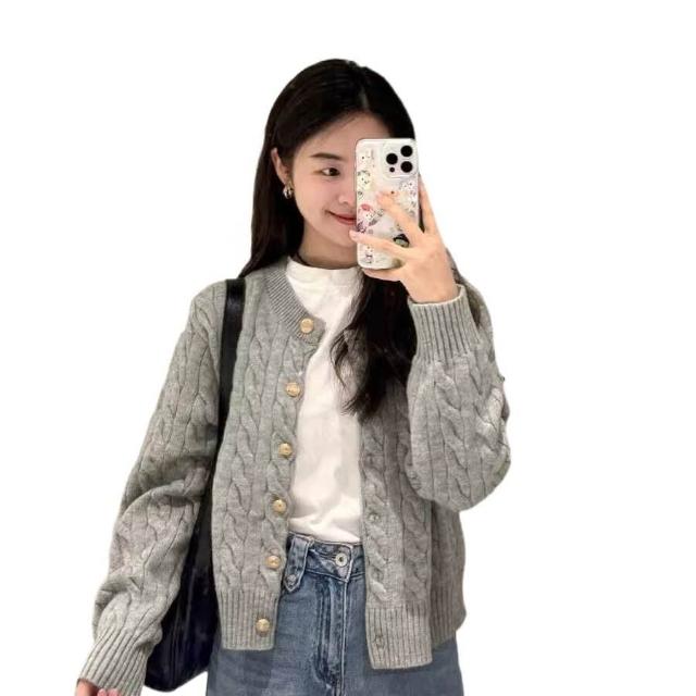 木槿衣坊 灰色麻花毛衣外套女春秋季2025新款感慵懶風短款針織開衫上衣