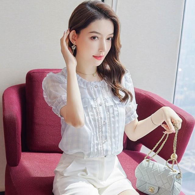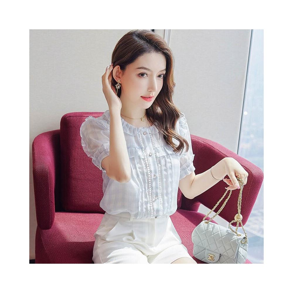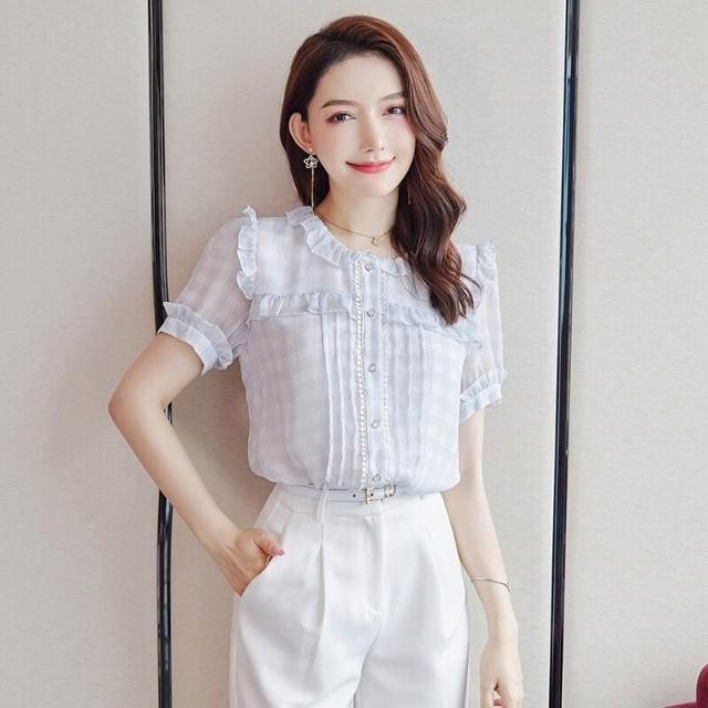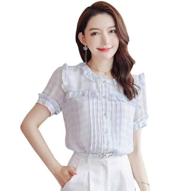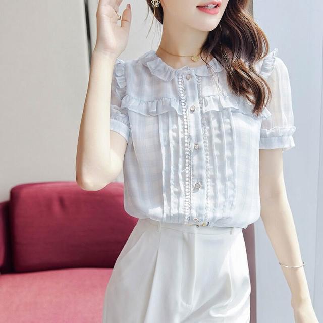 木槿衣坊 圓領荷葉邊短袖雪紡襯衫女夏季2025新款減齡氣質襯衣顯瘦上衣 6