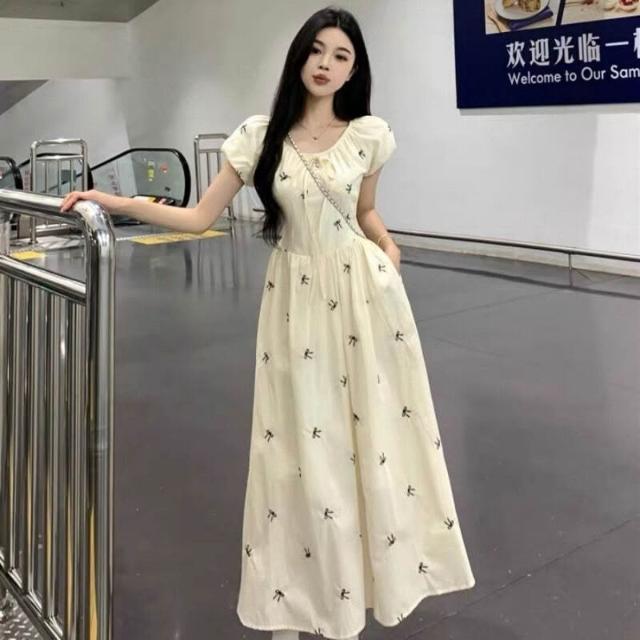 木槿衣坊 2025夏季新款印花法式蝴蝶結泡泡連衣裙氣質收腰顯瘦碎花長裙子女 083
