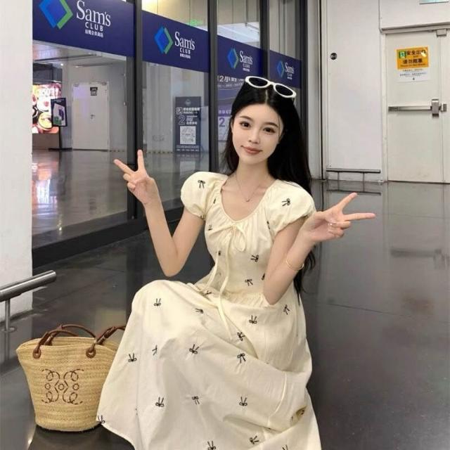 木槿衣坊 2025夏季新款印花法式蝴蝶結泡泡連衣裙氣質收腰顯瘦碎花長裙子女 083