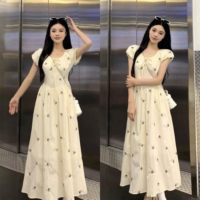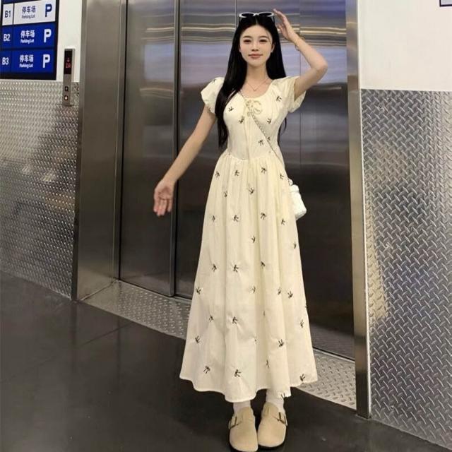 木槿衣坊 2025夏季新款印花法式蝴蝶結泡泡連衣裙氣質收腰顯瘦碎花長裙子女 083