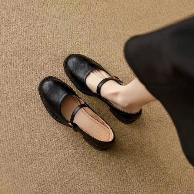 木槿衣坊 真皮復古瑪麗珍鞋女2025新款粗跟淺口單鞋軟底不累腳英倫風小皮鞋 825