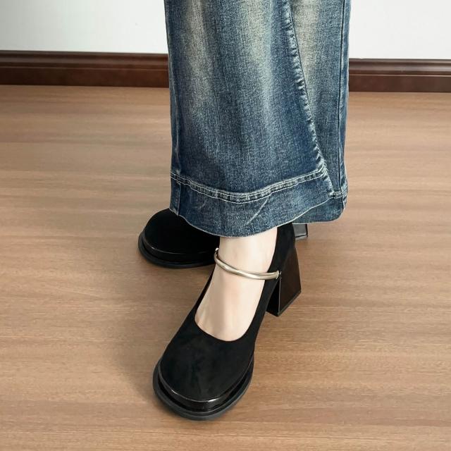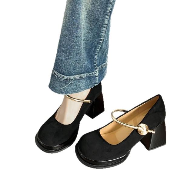 木槿衣坊 法式7 瑪麗珍鞋高跟鞋2026新款水鉆絨面一字帶粗跟淺口單鞋皮鞋 935